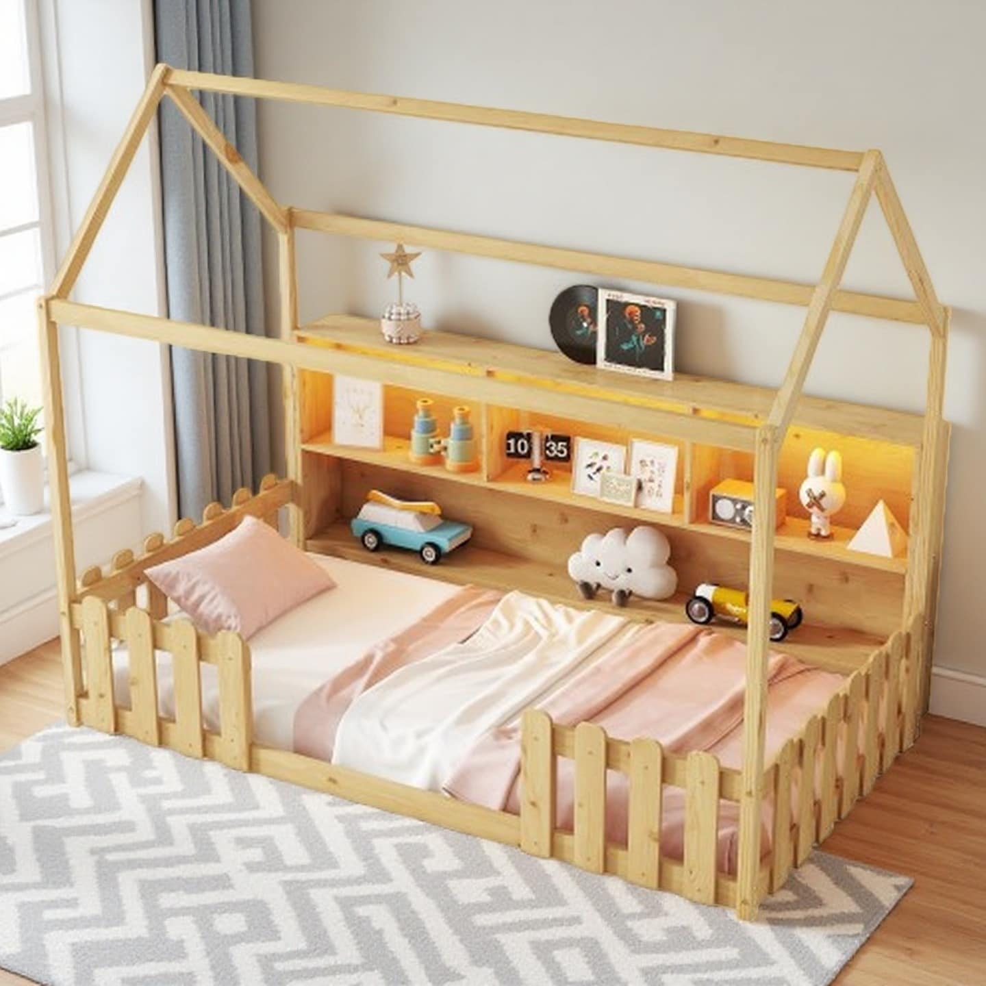 Twin Wooden House Bed with LED Light, Built-in Bookshelf & Safety Guardrails