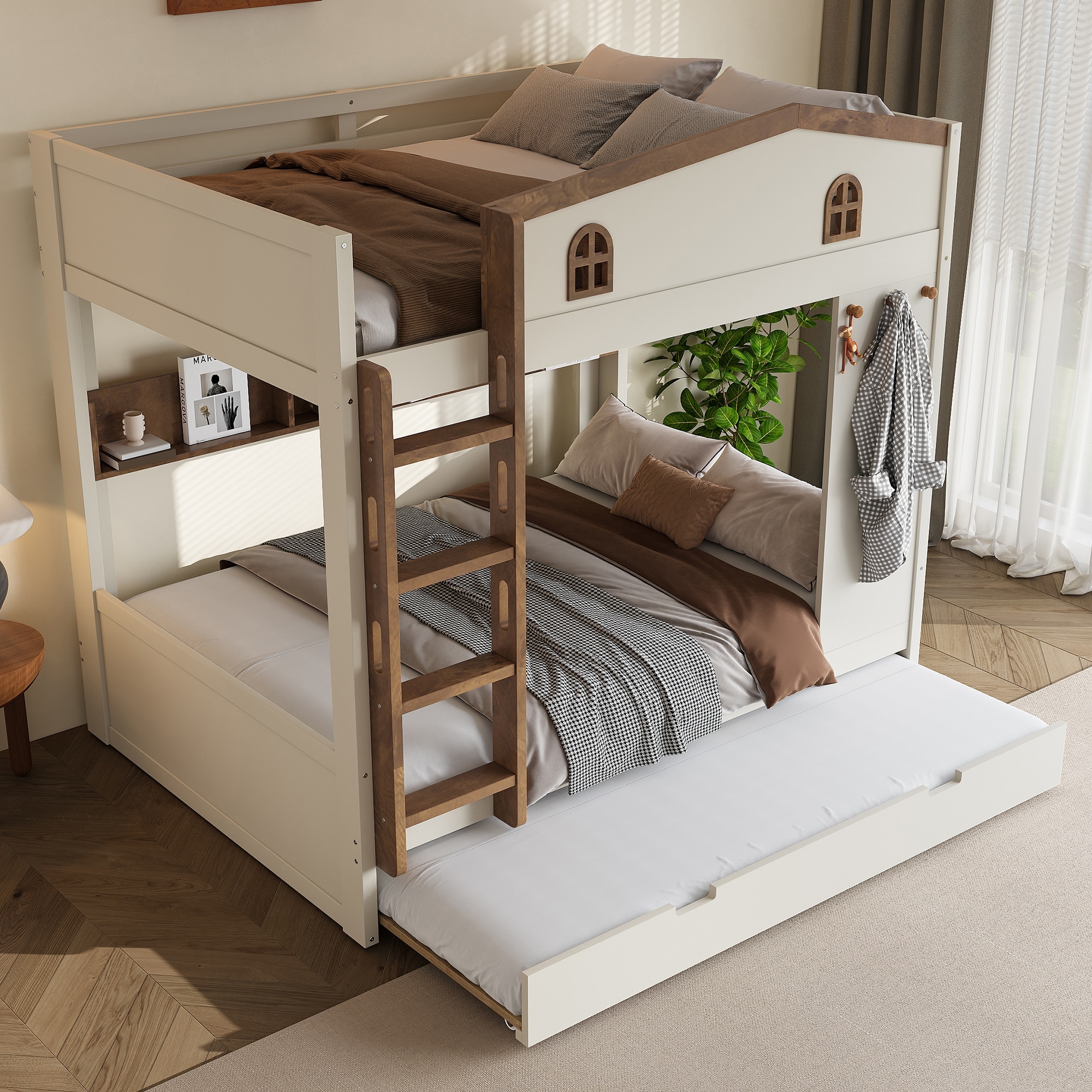 Full over Full/Queen over Queen Bunk Bed with Trundle and Storage Shelves, Wood Bunk Bedframe with Hooks, No Box Spring Needed