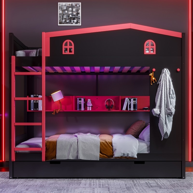 Fairytale Full Size House-shaped Loft Bed with Striped Fabric Canopy, Fun Slide Design and Built-in Bookshelves