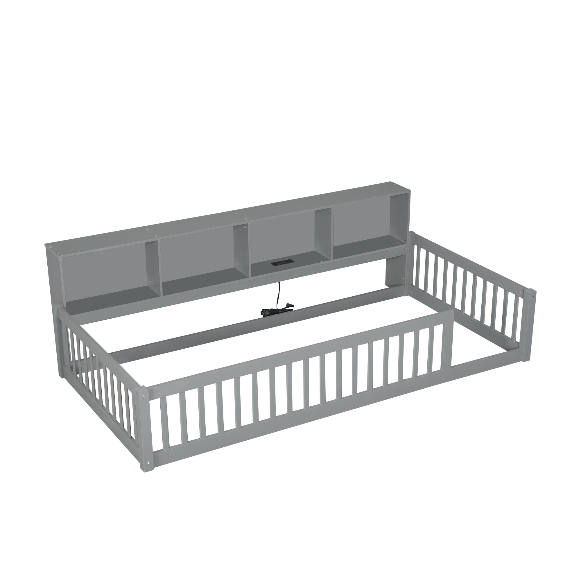 Twin Size Wooden Bed Montessori Bed Frame w/ Storage Shelves