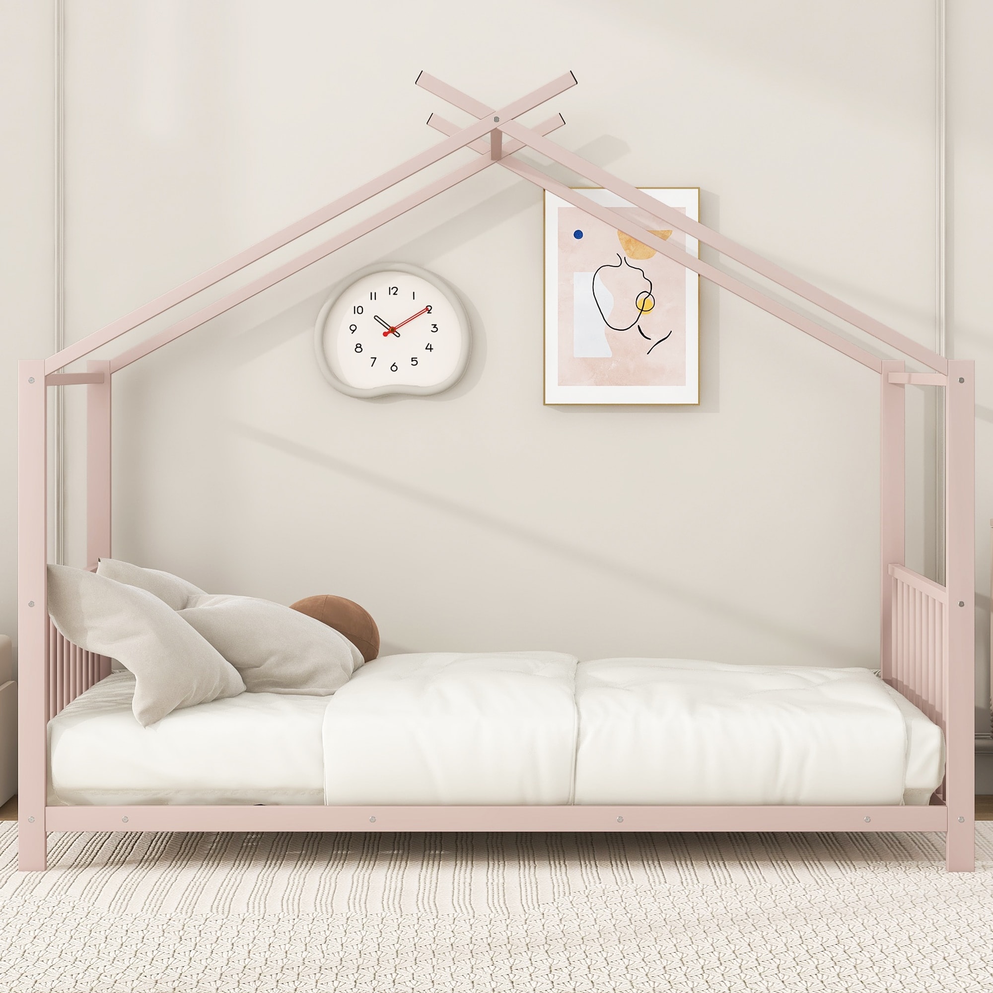 Twin Over Twin House Floor Bunk Bed with Headboards,Ladder, Rubber Wood Bunk Bed with Safety Guardrails