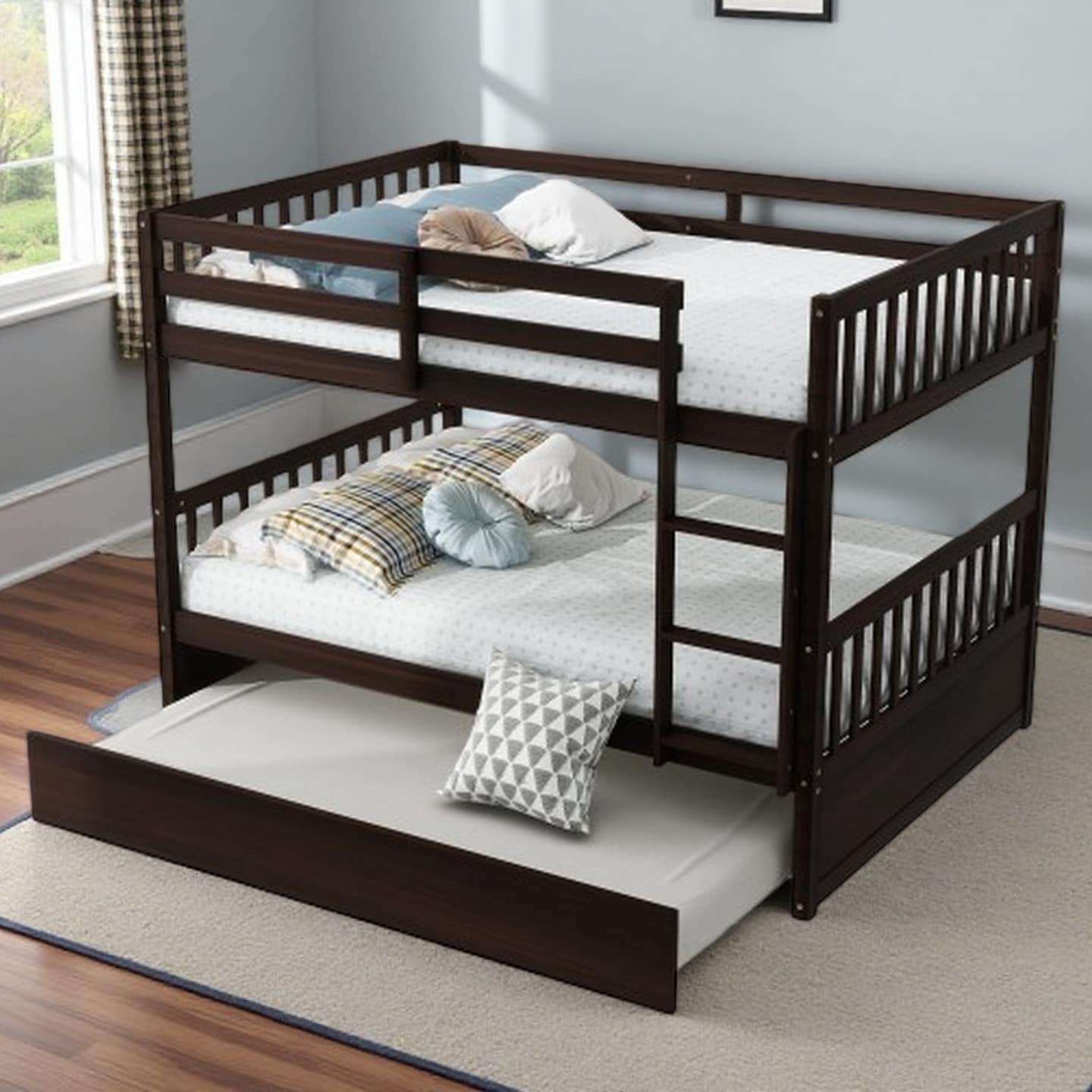 Full Over Full Bunk Bed with Twin Trundle, Convertible Rubberwood Frame with Ladder and Guardrails