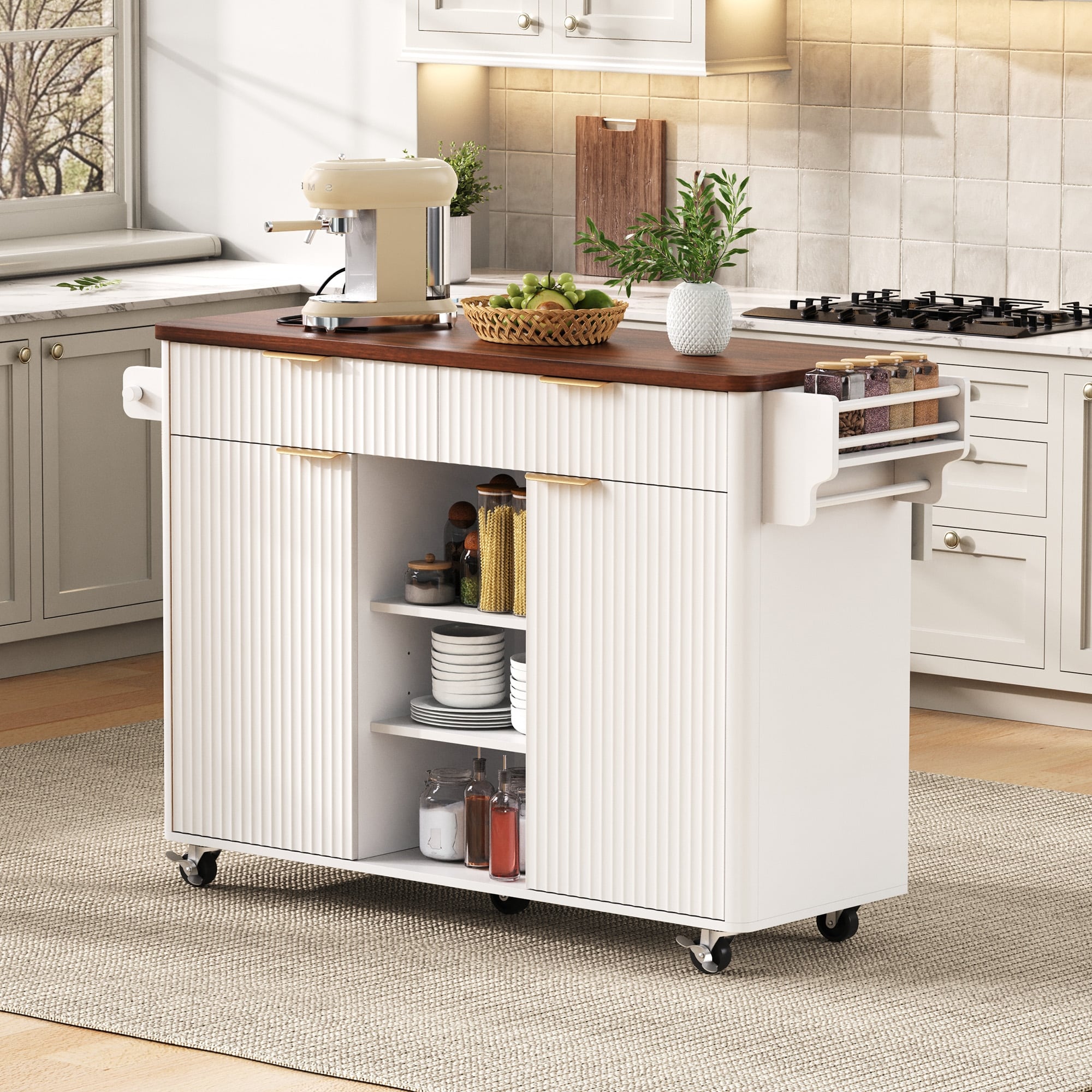 Anmytek 55.7" Rolling Kitchen Island with Drop Leaf, Power Outlet, Storage, White