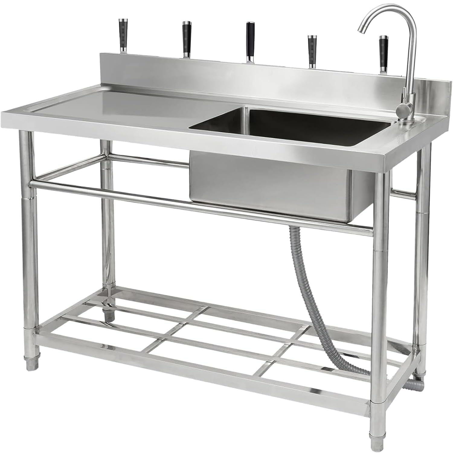 47 Inch Stainless Steel Utility Sink, Freestanding Single Bowl w/Pull-Out Hot & Cold Faucet, Shelf, Adjustable Legs - 47*20*37