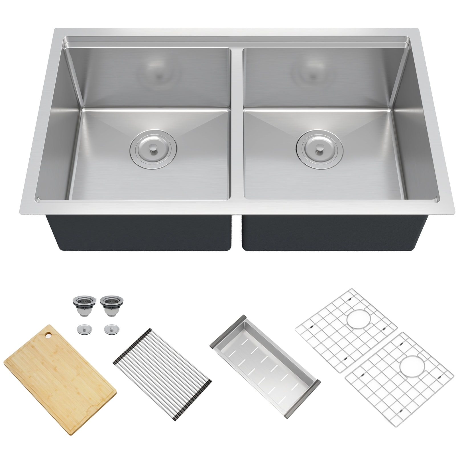 33 x 19 Inch Undermount Kitchen Sink, Double Bowl Workstation Sink w/Ledge & Cutting Board, Dish Rack, Drying Rack - 33*19*10