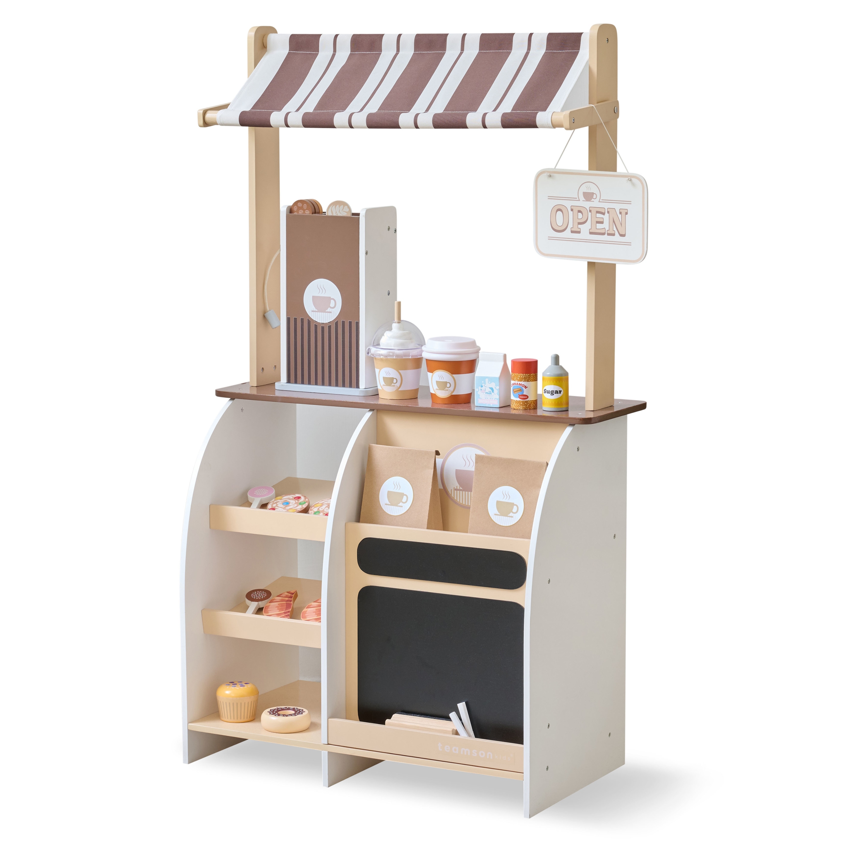 Teamson Kids Wooden Coffee Stand Pretend Play with Coffee Machine and 29 Pcs Accessories for Age 3-5 Kid and Toddlers