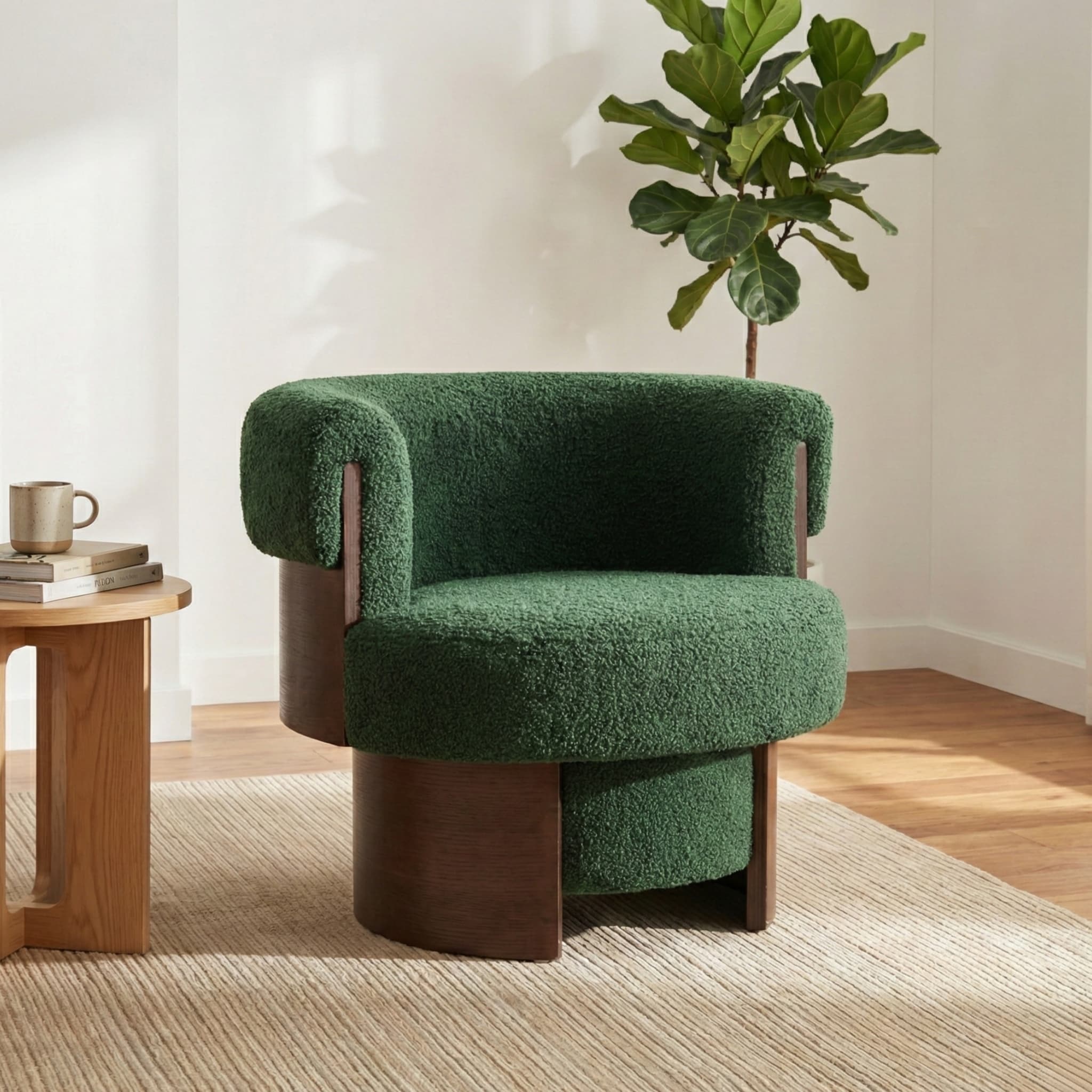 Roomfitters 32 Inch Mid Century Modern Barrel Chair Boucle Accent Armchair with Wood Base for Living Room Bedroom
