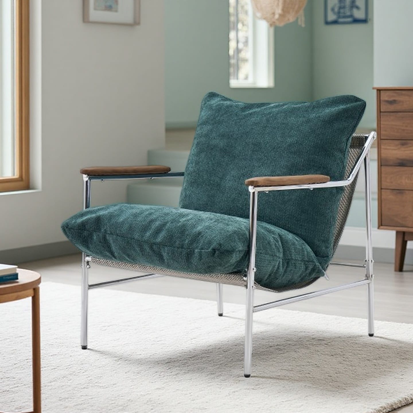 Mid Century Modern Upholstered Accent Chair with Metal Frame & Wood Armrests, Comfy Lounge Armchair with High Density Cushion