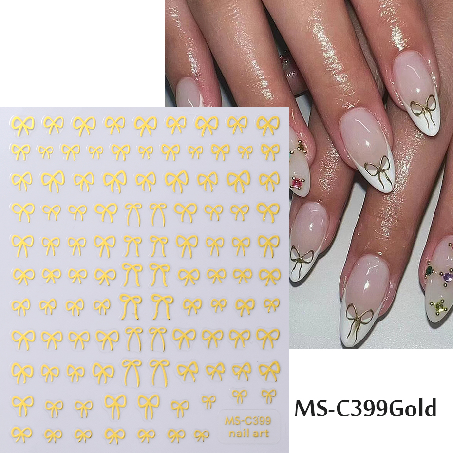 Self Adhesive Nail Art Stickers, Mini Bowknot Design With Lace Ribbons, Bows & Butterfly Decals For Stunning Nails ms c399 Gold