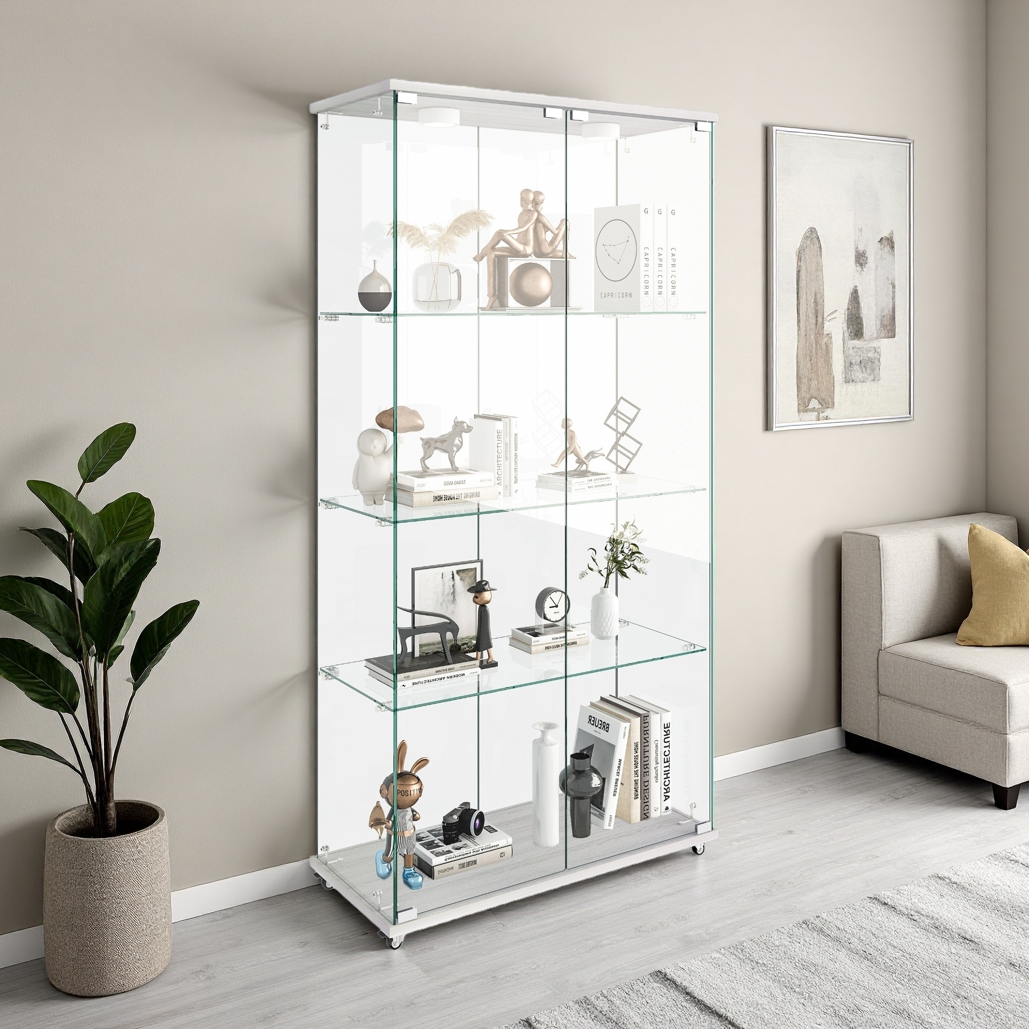 64.25"H Modern Glass Display Cabinet with LED Lights, 2-Door 4-Shelf Tempered Glass Bookshelf, Cabinet for Living Room & Bedroom