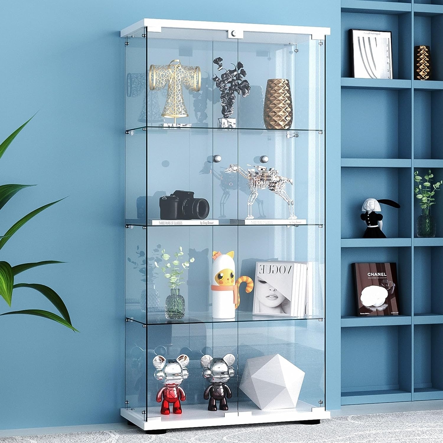 Glass Display Cabinet 4-Shelf 2 Doors with LED Push Light Lockable, 5mm Tempered Glass Floor-Standing Glass Bookshelf