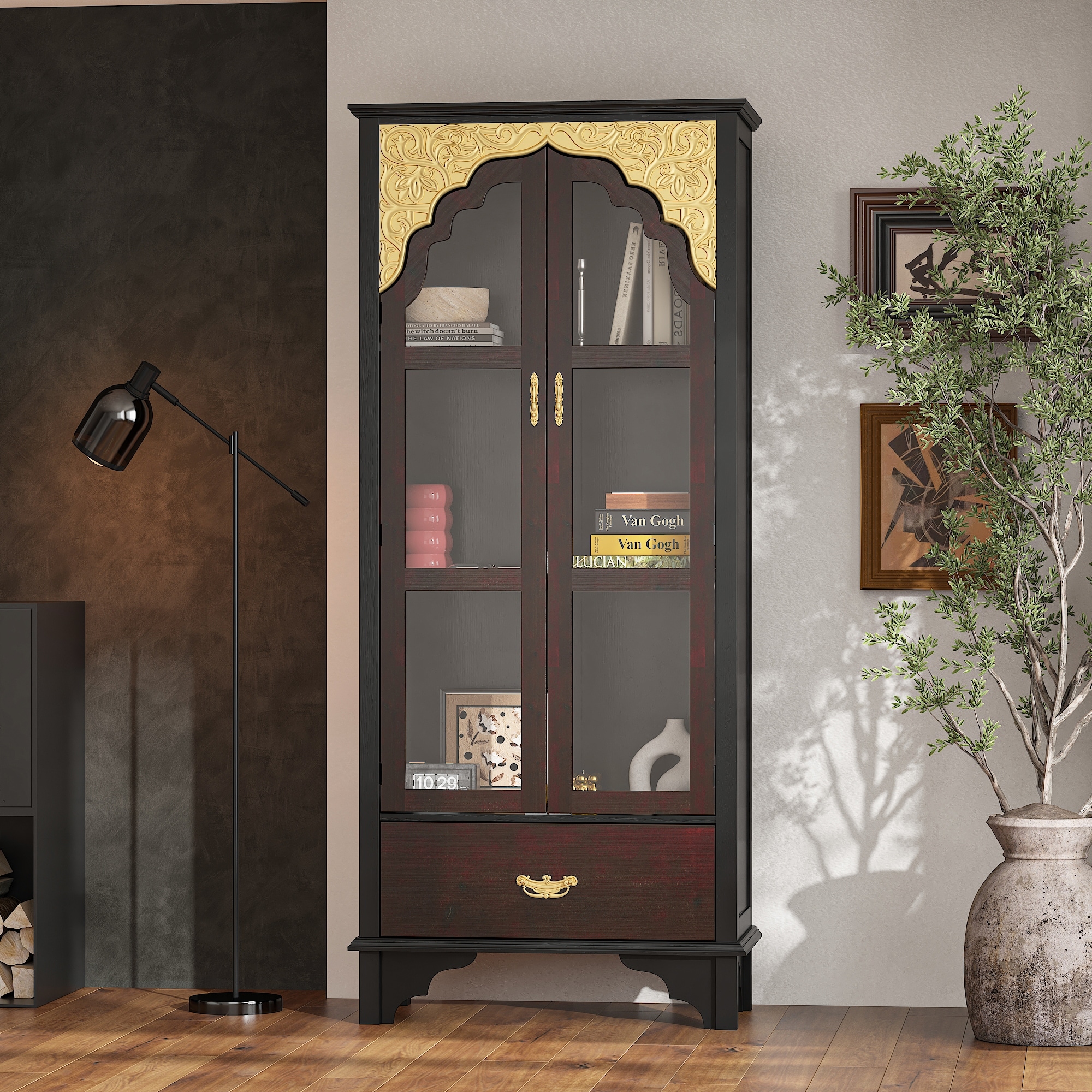 Boho Wood & MDF Display Cabinet with Tempered Glass Doors, Carved Arch Frame & Metal Handle Drawer