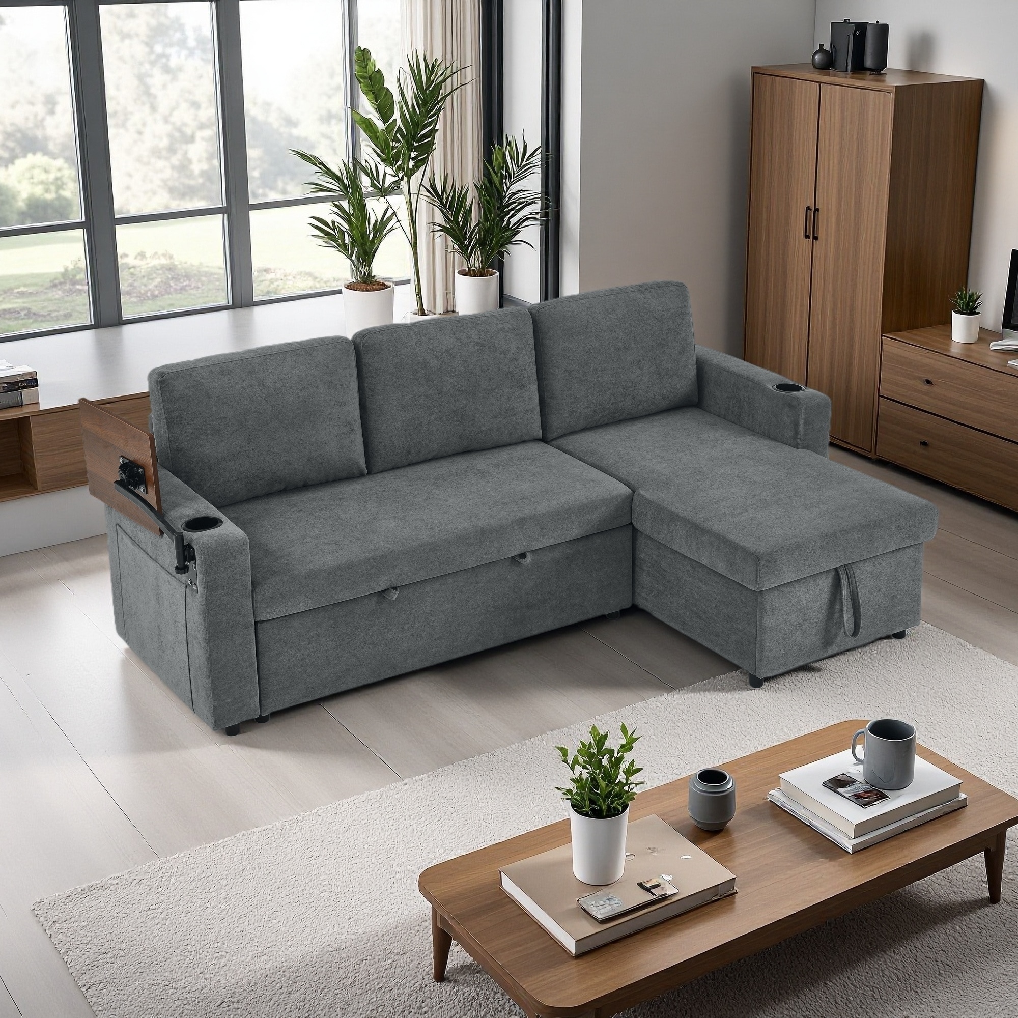 85" Chenille Multi-Functional 3-Seater Sofa with Pull-Out Bed, Retractable Table and LED Lighting