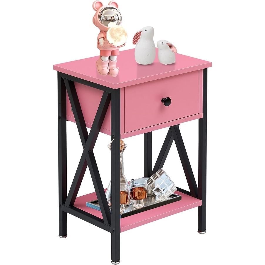 Modern Nightstand with Drawer and Storage Shelf, Industrial Metal Frame for Bedroom or Living Room