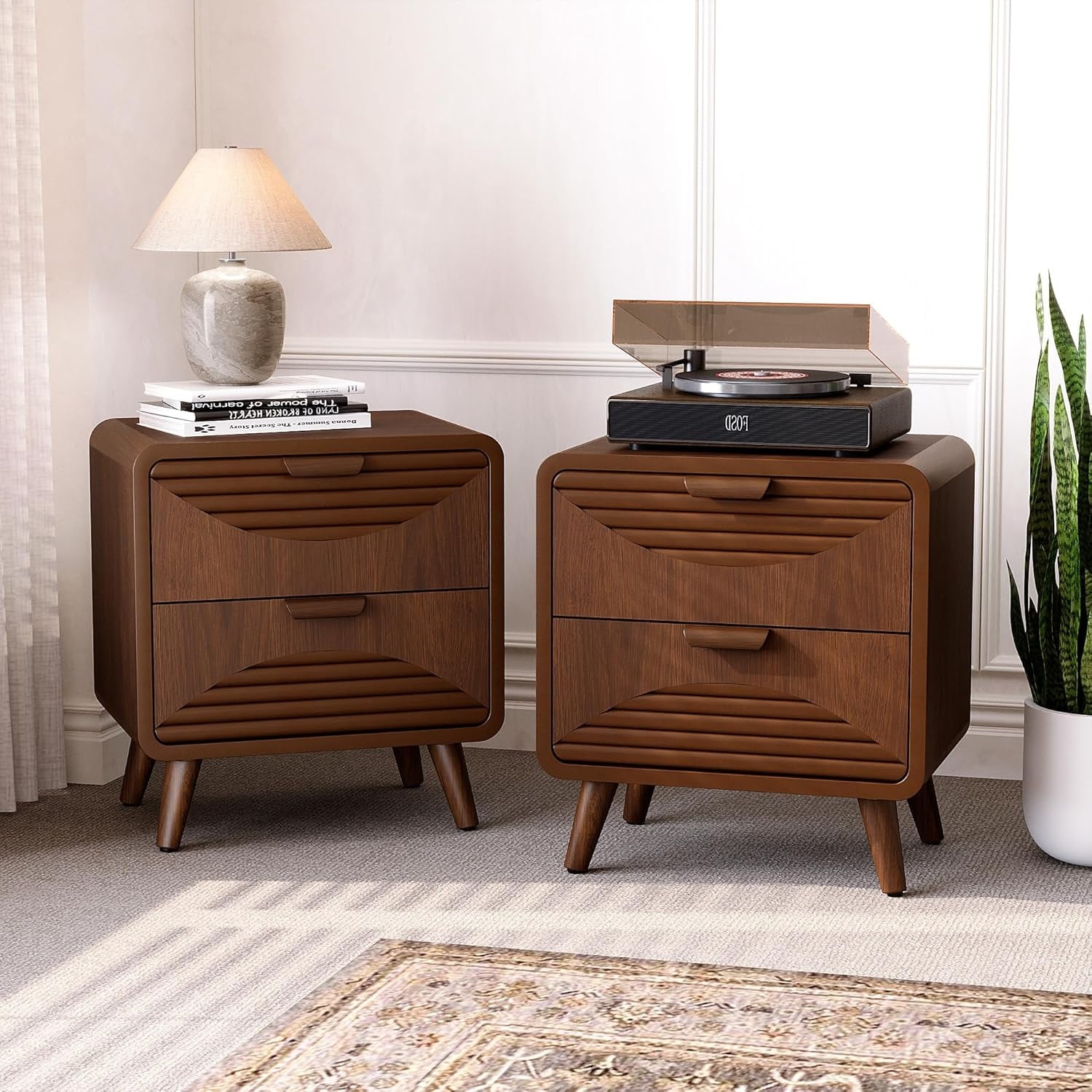 Modern Night Stand with 2 Drawers, Wood End Table with Stripe Pattern, Walnut Finish, Adjustable Feet, Easy Assembly