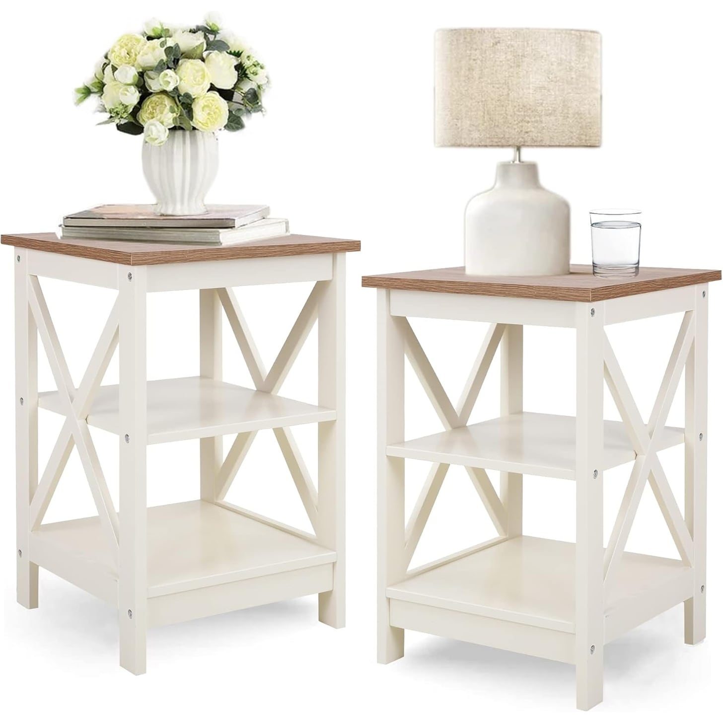 Set of 2 Farmhouse End Tables with 3-Tier Shelf, Ivory White Nightstands for Living Room or Bedroom