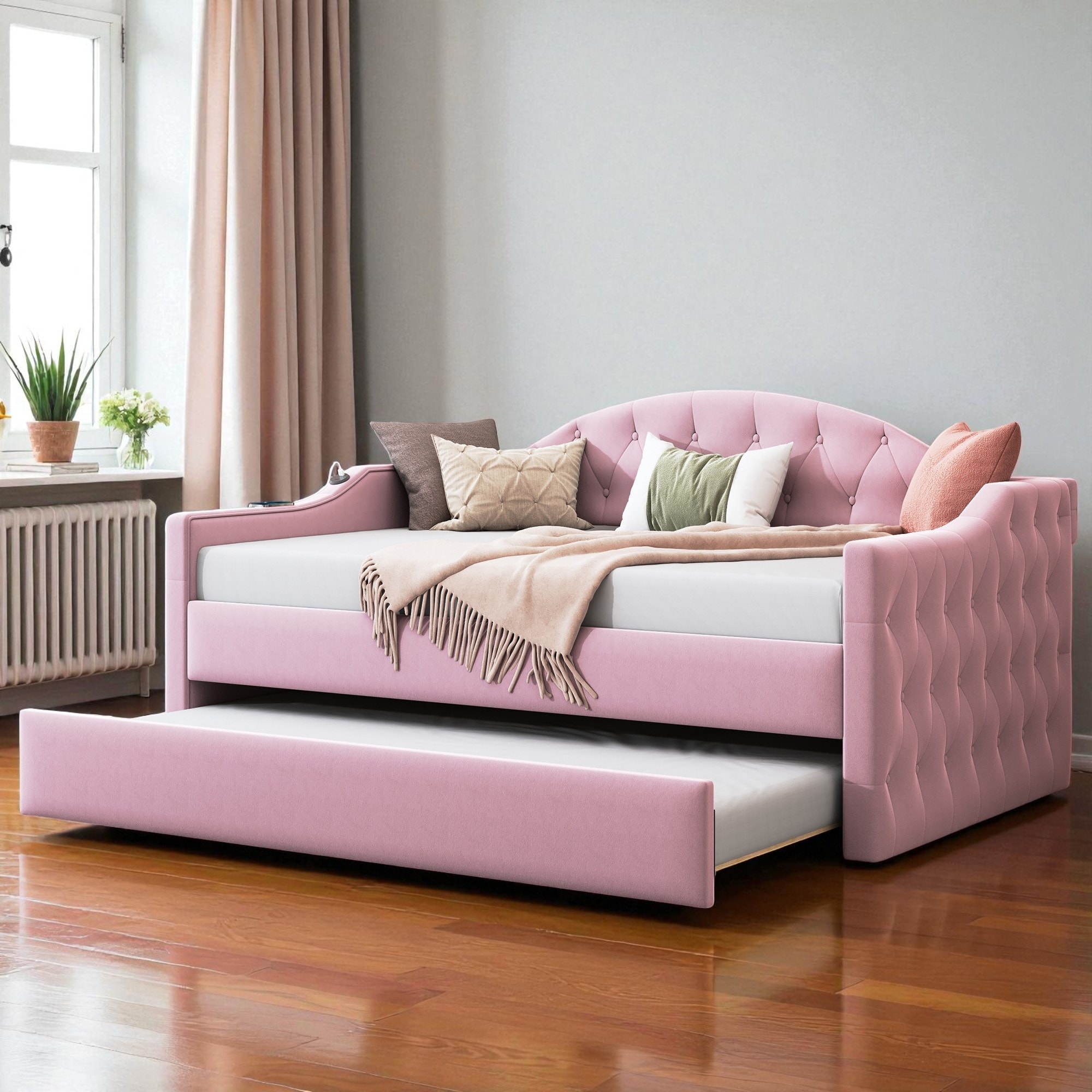 Twin Size Tufted Velvet Upholstered Daybed with Trundle, USB & Type-C Charging Ports, No Box Spring Needed