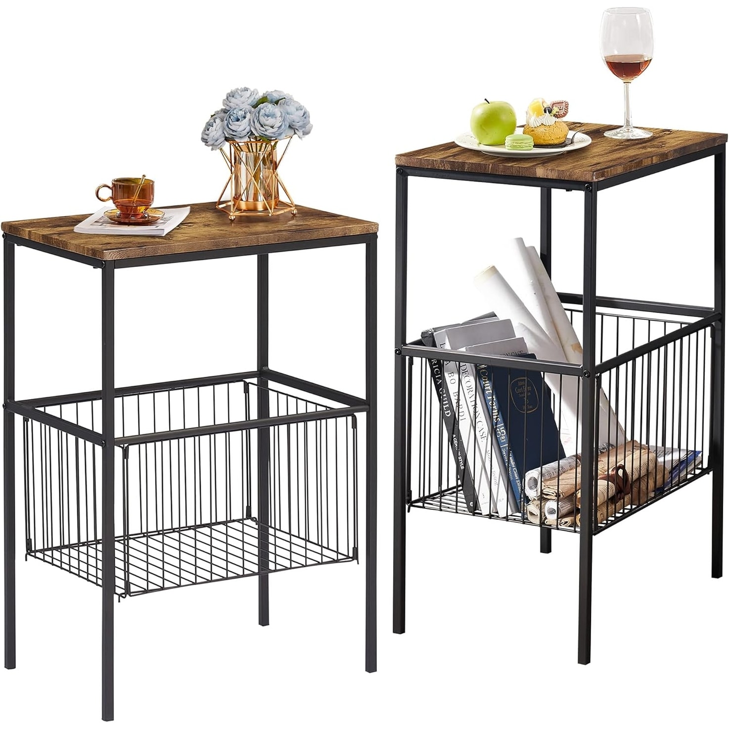 2-Pack Modern Tall End Tables with Metal Storage Basket, Wooden Nightstand with Shelf for Bedroom, Living Room, Bathroom