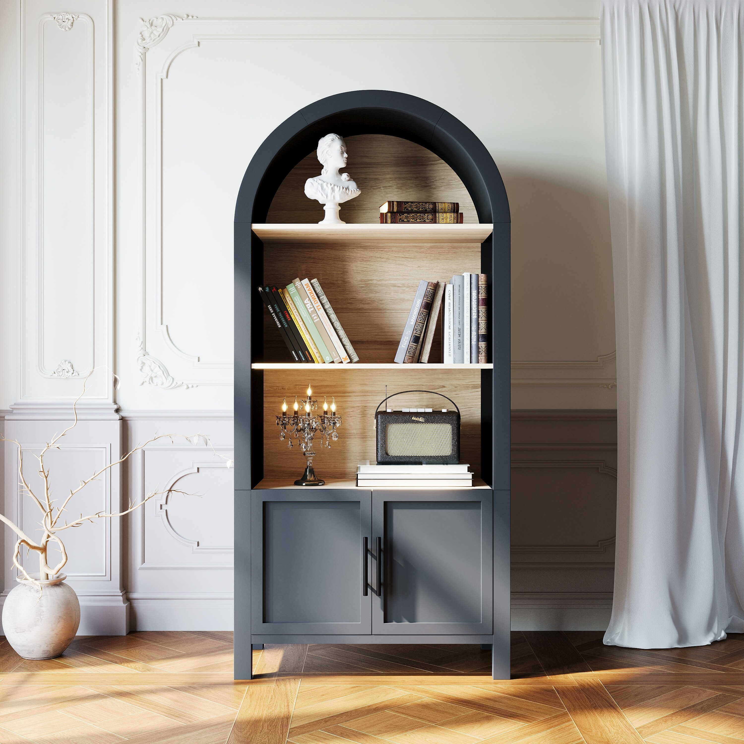66.70 inch Tall Arched Bookcase with Storage, 3-Tier Arched Cabinet with Door, Arched Bookshelf Cabinet (Black)