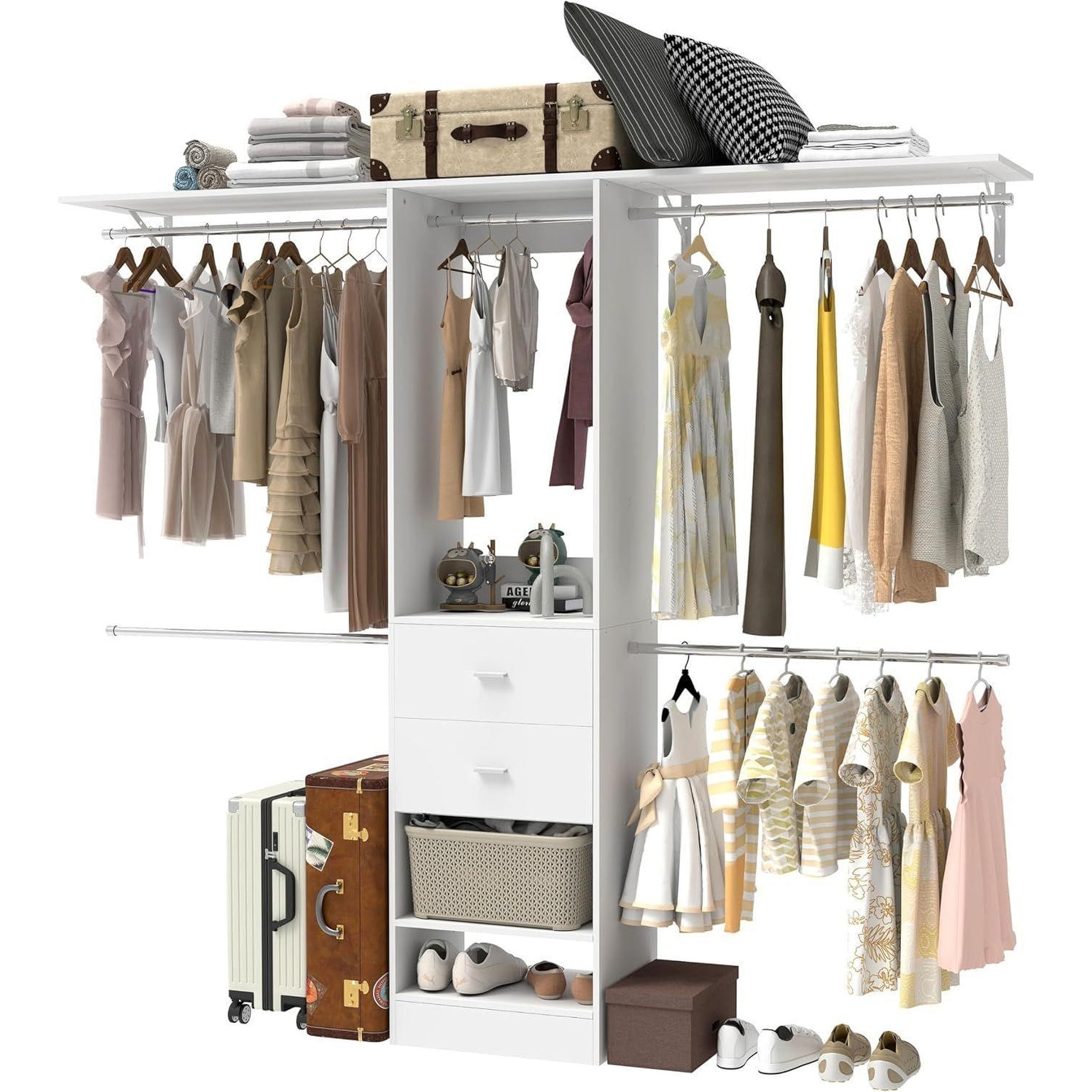 Closet System, Walk-In Organizer with 2 Drawers & 5 Expandable Rods, Adjustable 4-9Ft, White