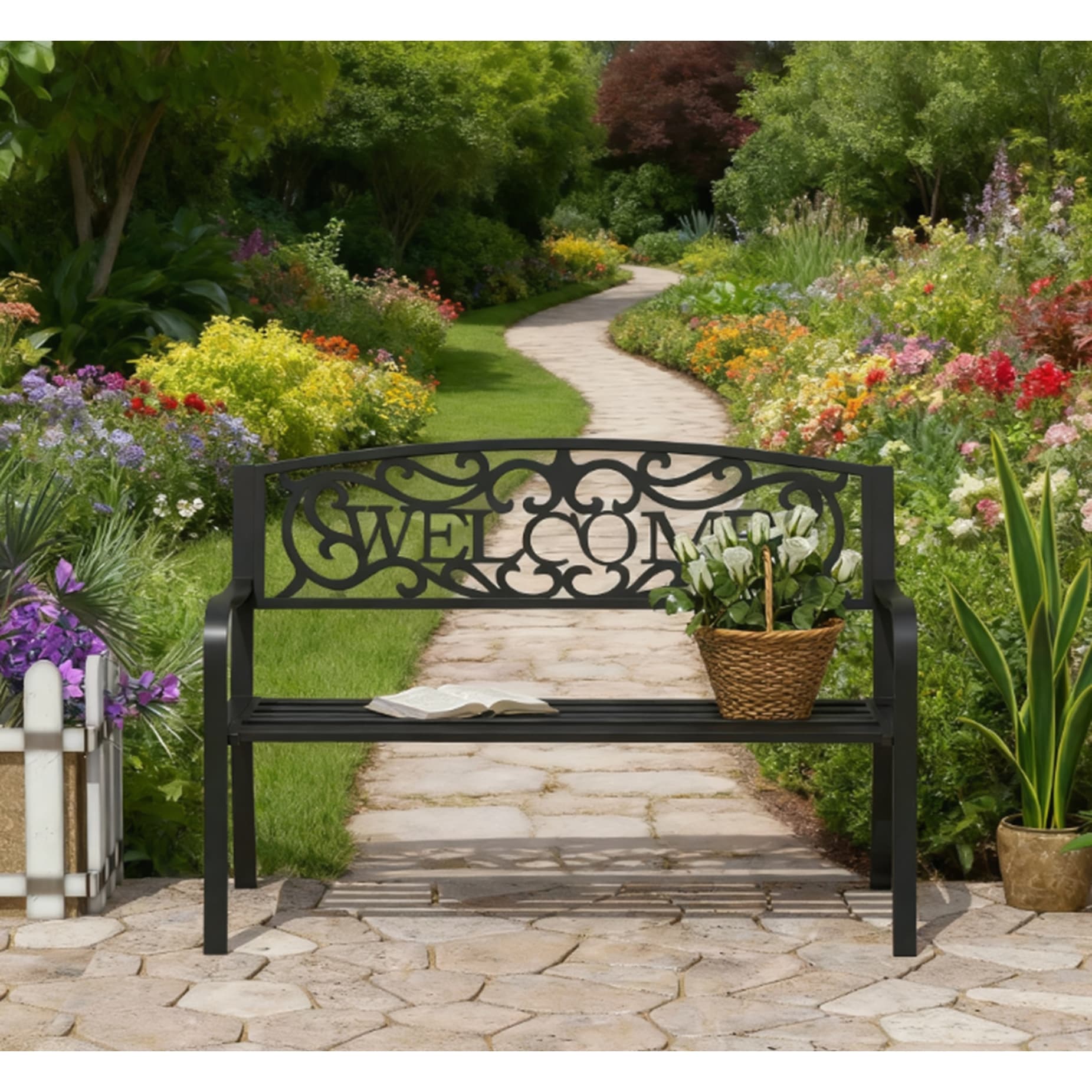 Garden Bench Loveseat with Cast Iron Welcome Vines, Durable and Rust-Resistant for Outdoor Use