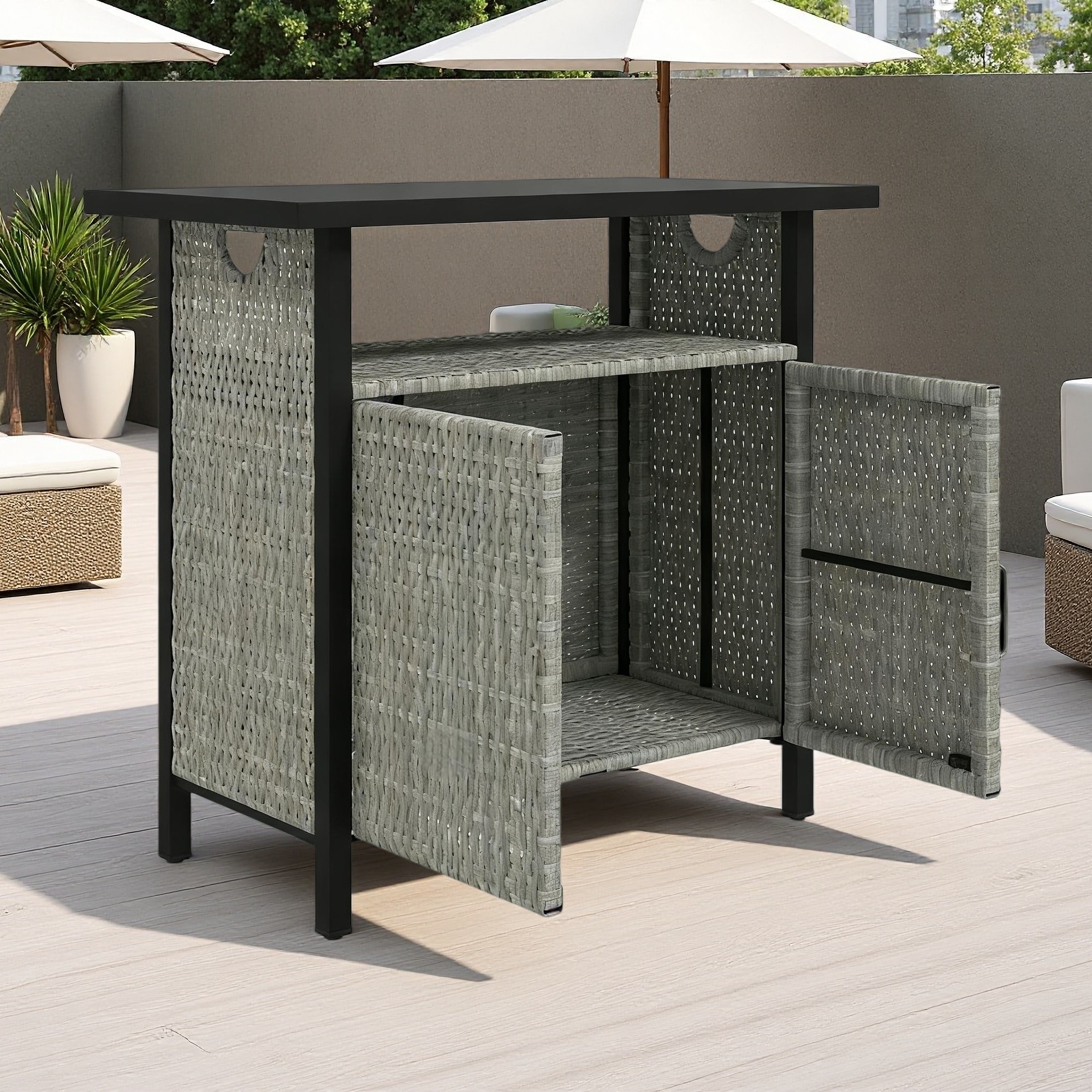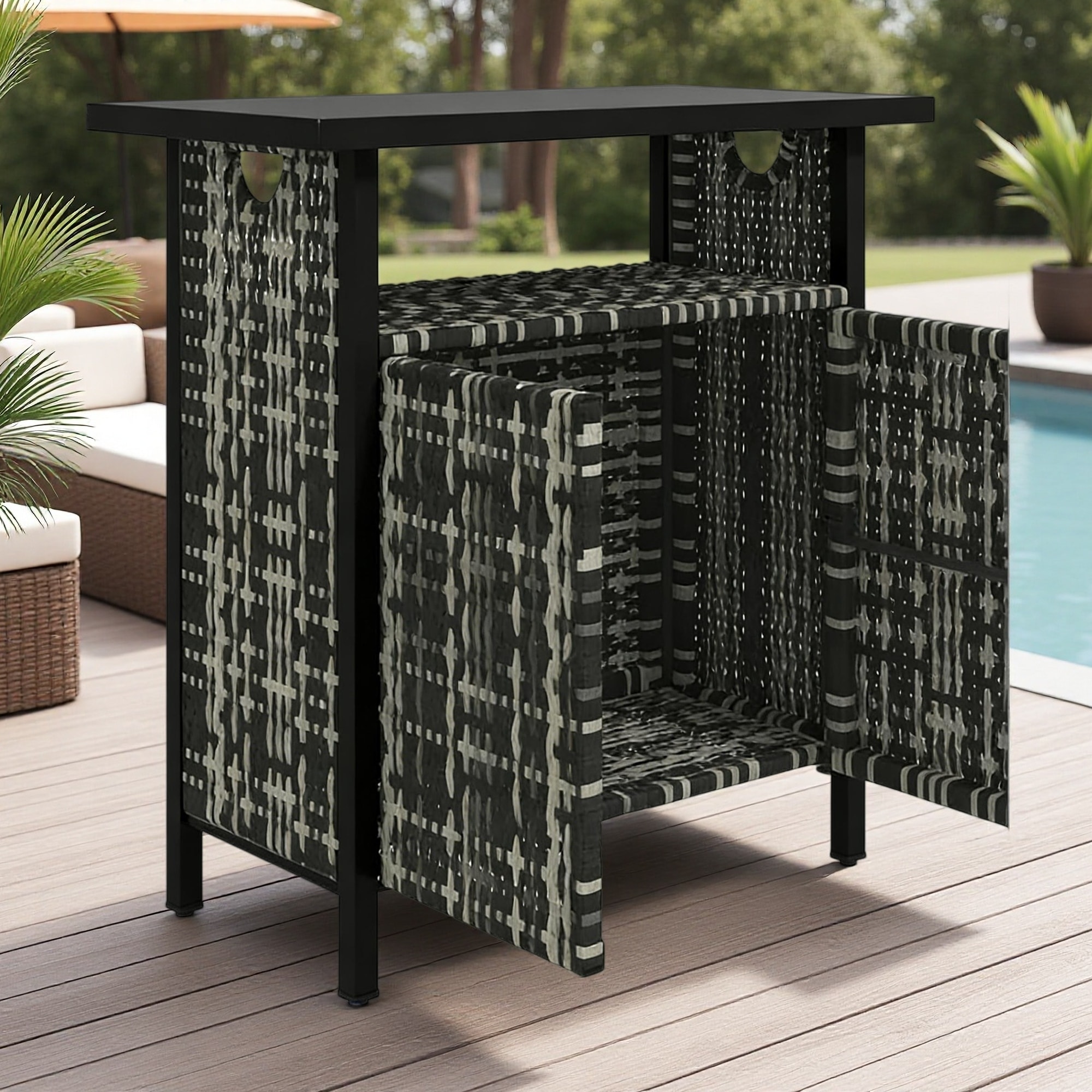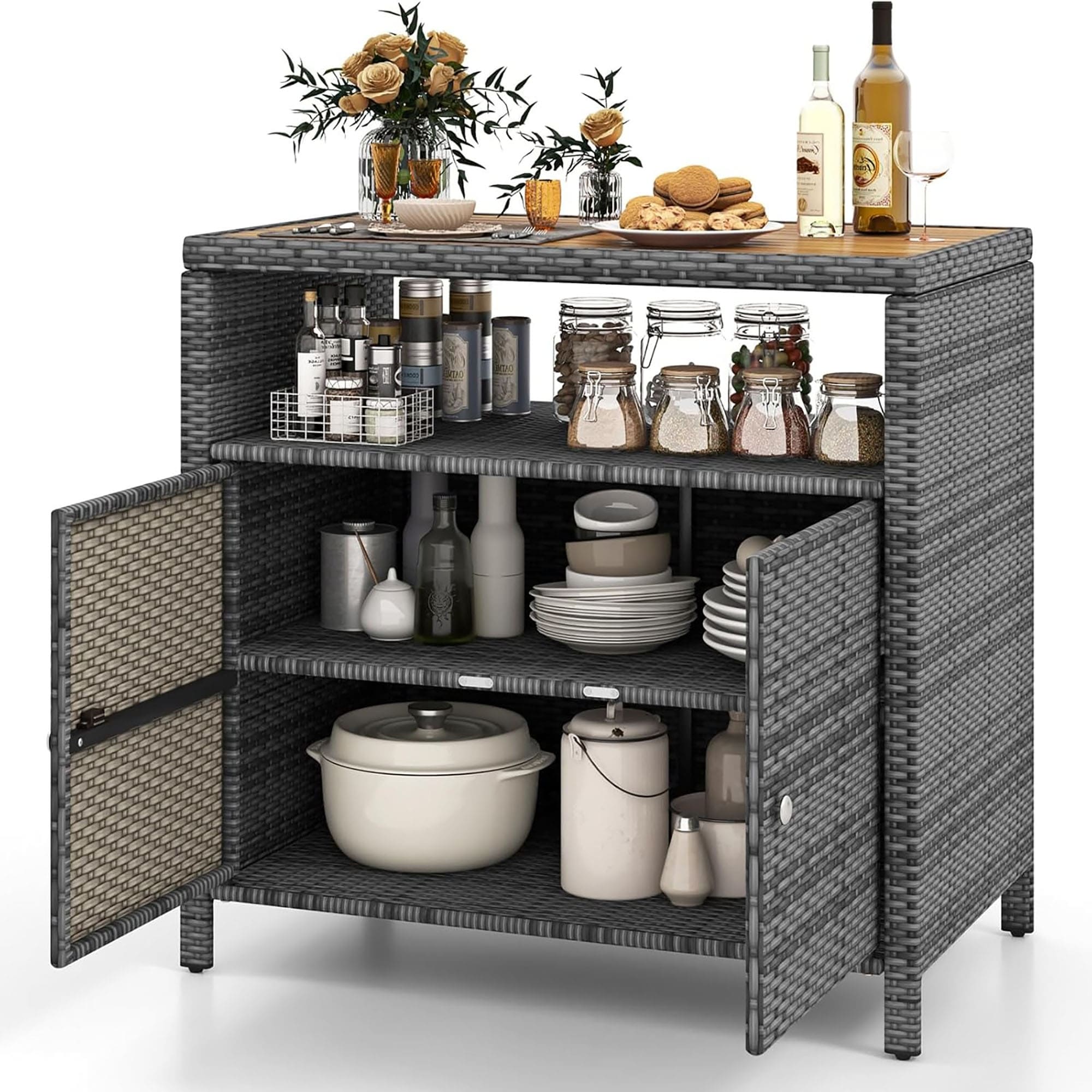 Wicker Outdoor Cabinet PE Rattan Kitchen Island with Acacia Wood Top