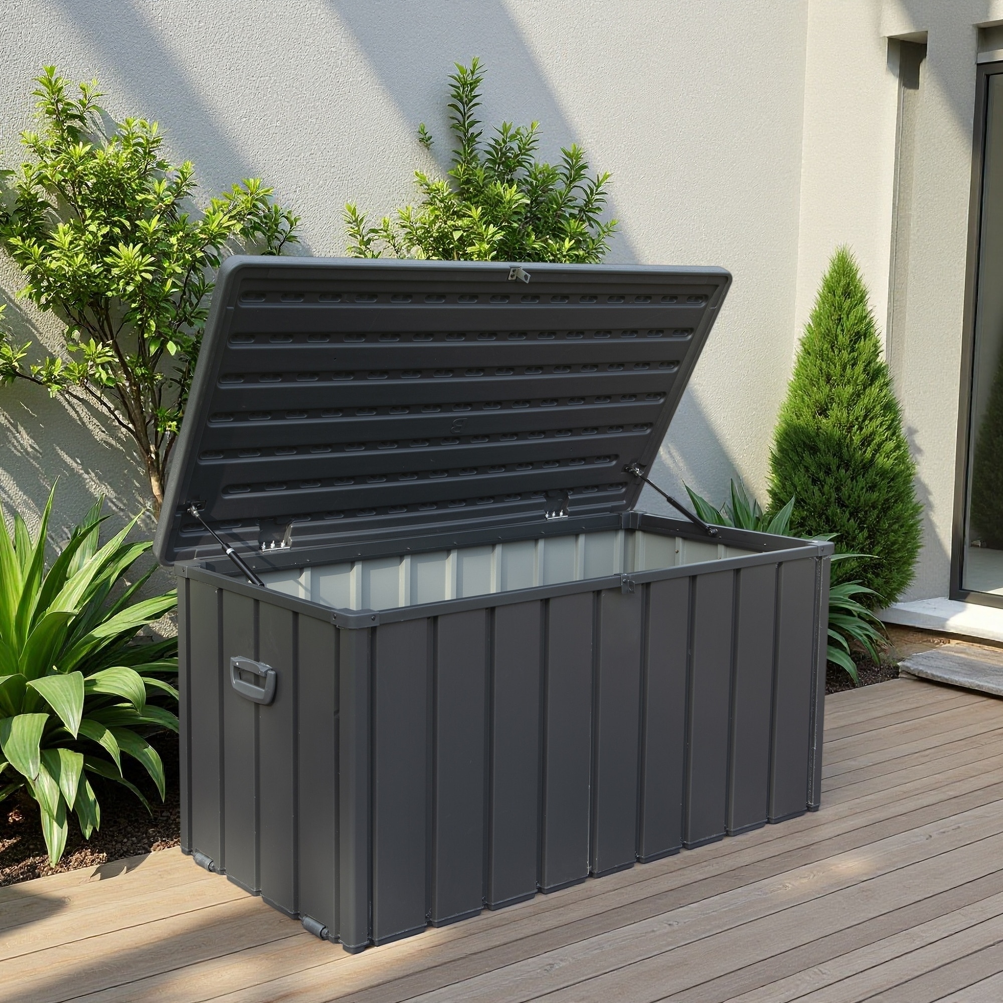 Lockable Outdoor Metal Storage Box with Outside Cushions, Throw Pillows