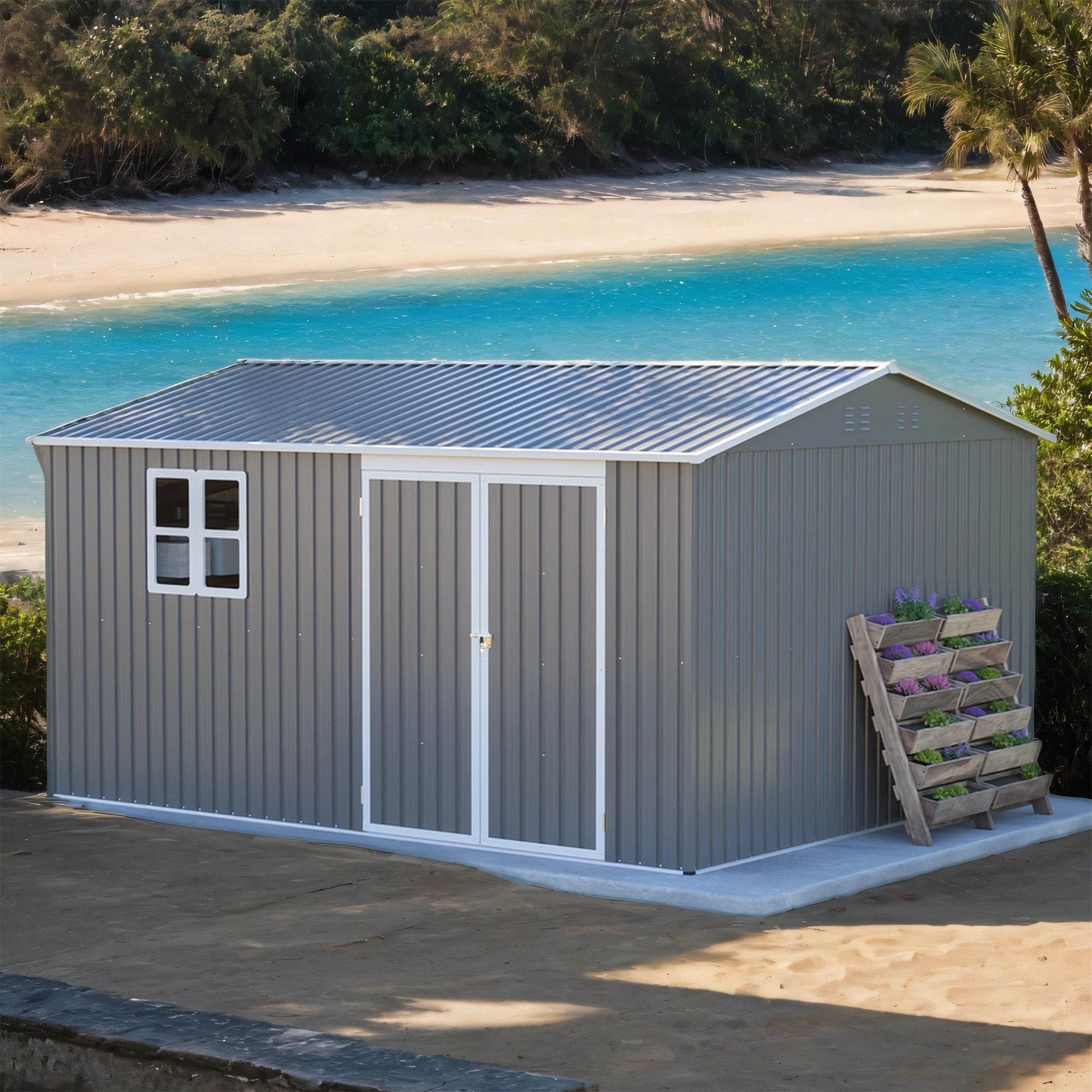 12x10 FT Galvanized Steel Storage Shed with Lockable Door and Windows