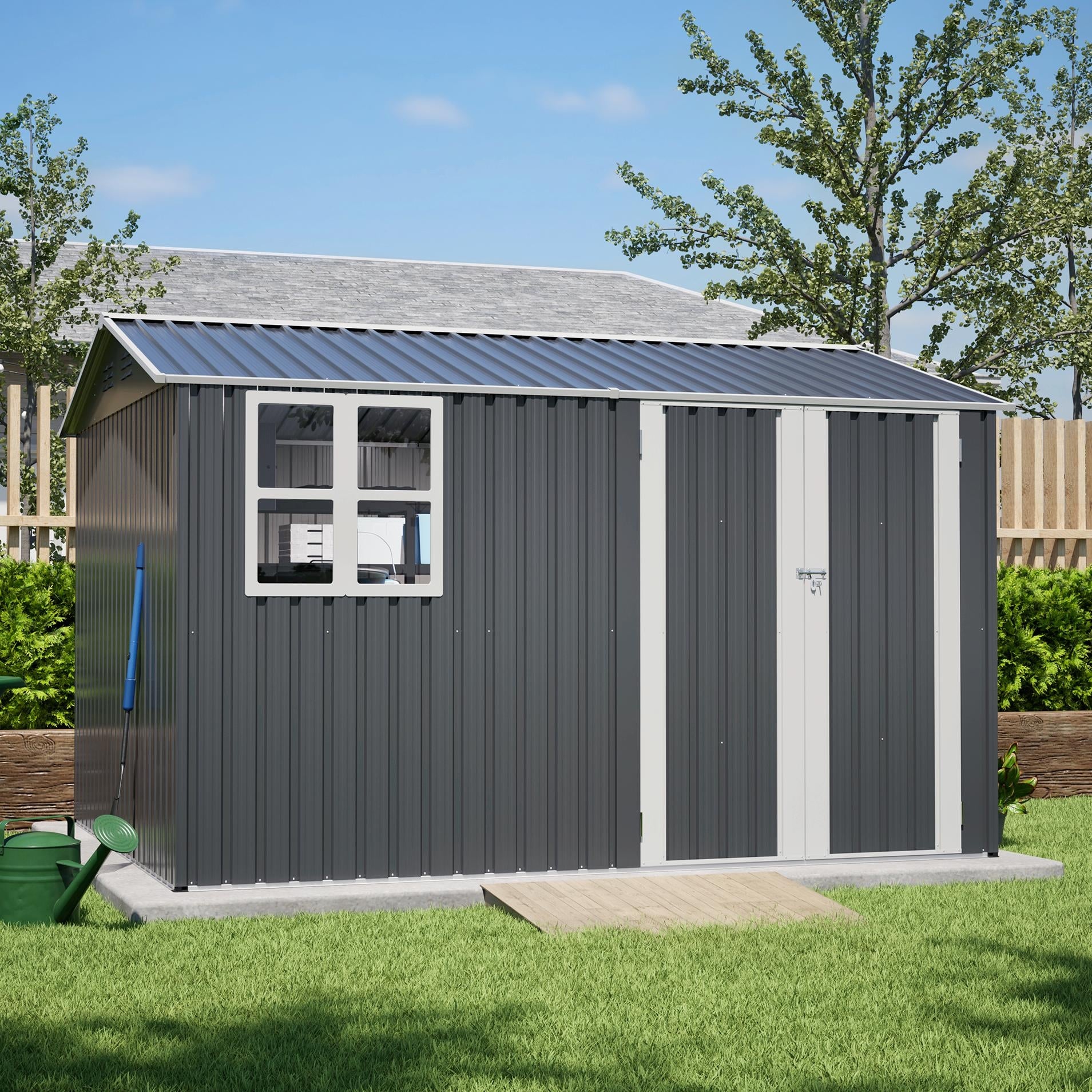 Outdoor Storage Shed 9×11 FT with 3 Lockable Doors,Tool Shed Metal Storage Garden Sheds 4 Vents,with Galvanized Steel Frame