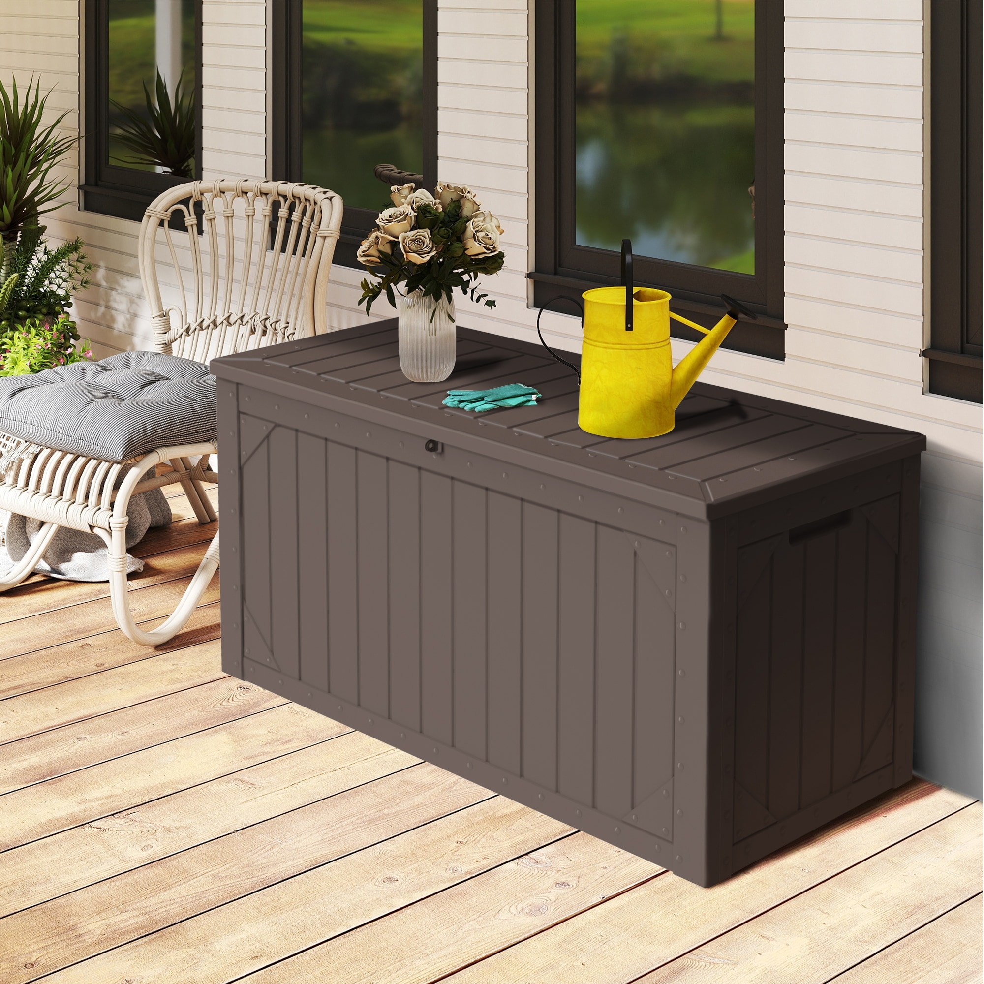 110 Gallon Resin Backyard Deck Box, Lockable Patio Storage Bench and Outdoor Poolside Accessory Organizer, Brown