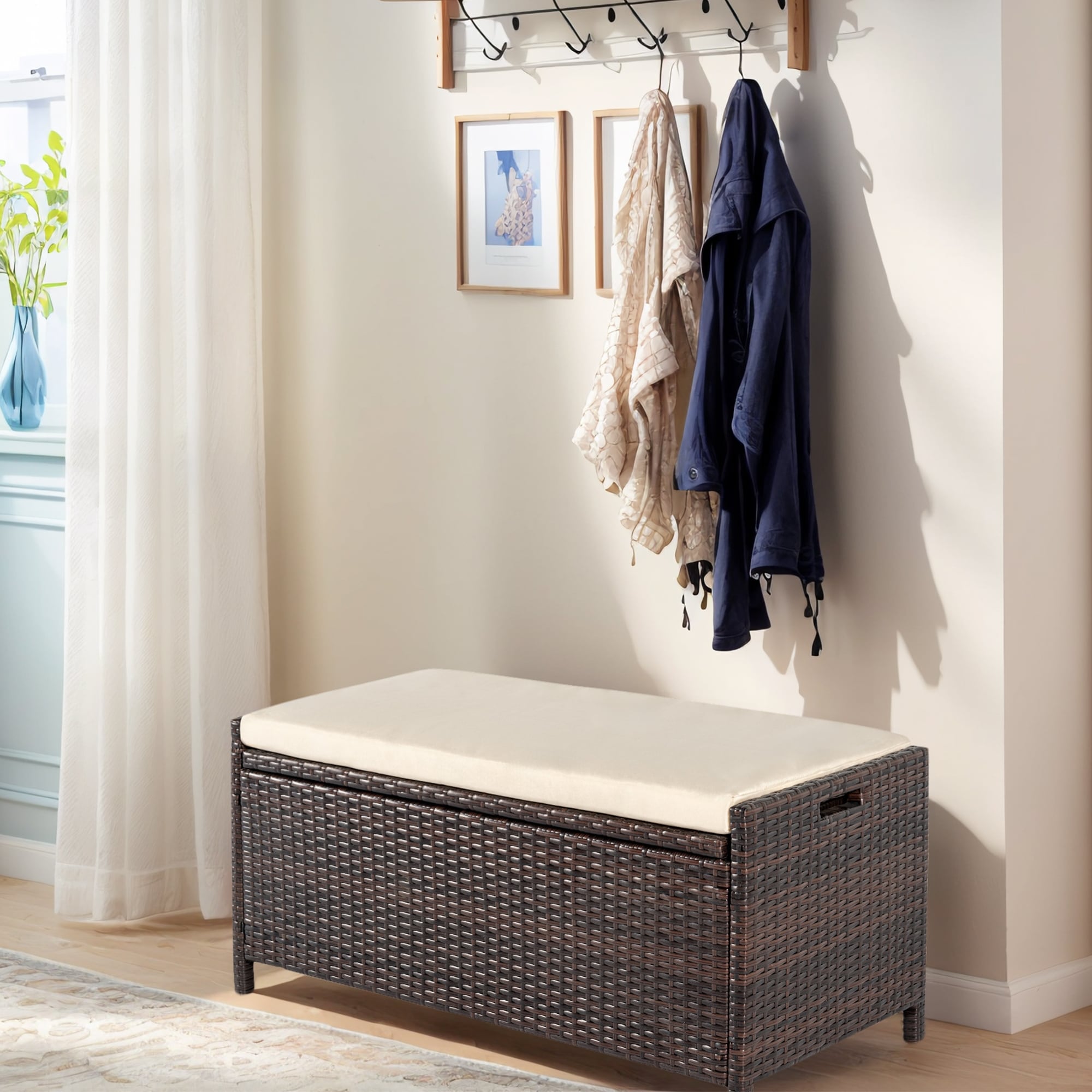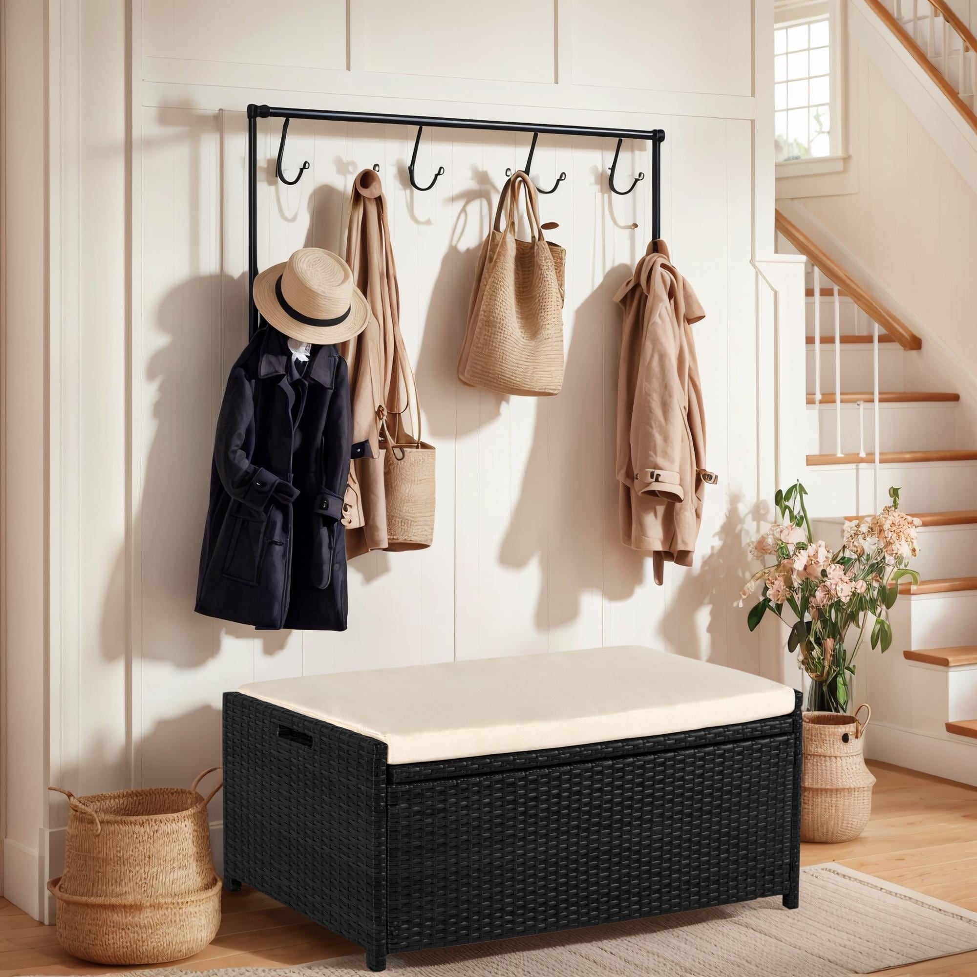 Outdoor Wicker Storage Bench Deck Box, Patio Furniture Pool Container Storage Bin with Seat and Comfortable Cushion