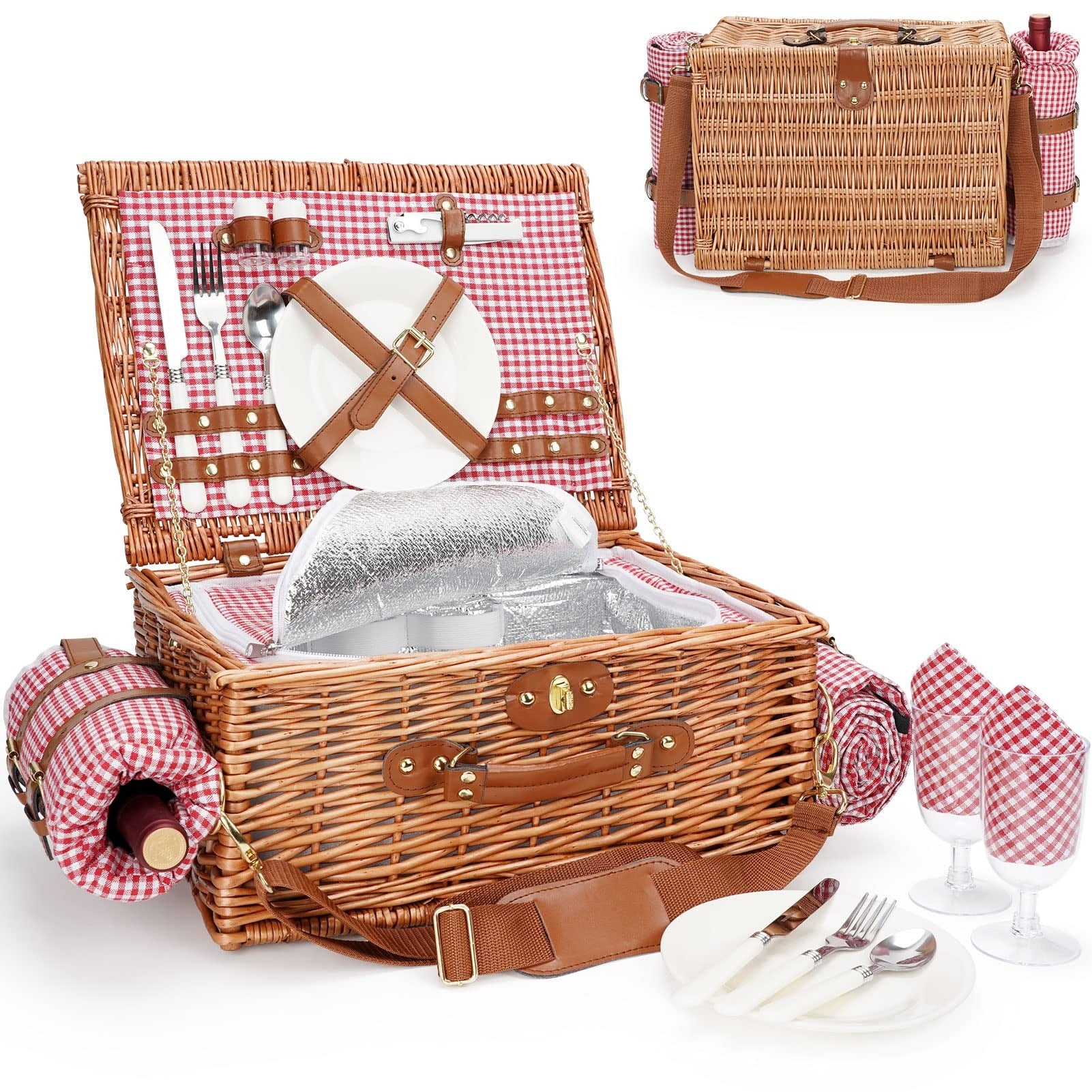 Picnic Basket for 2,Waterproof Blanket, Picnic Hamper Set with Washable Beach Mat & Large Insulated Cooler Compartment