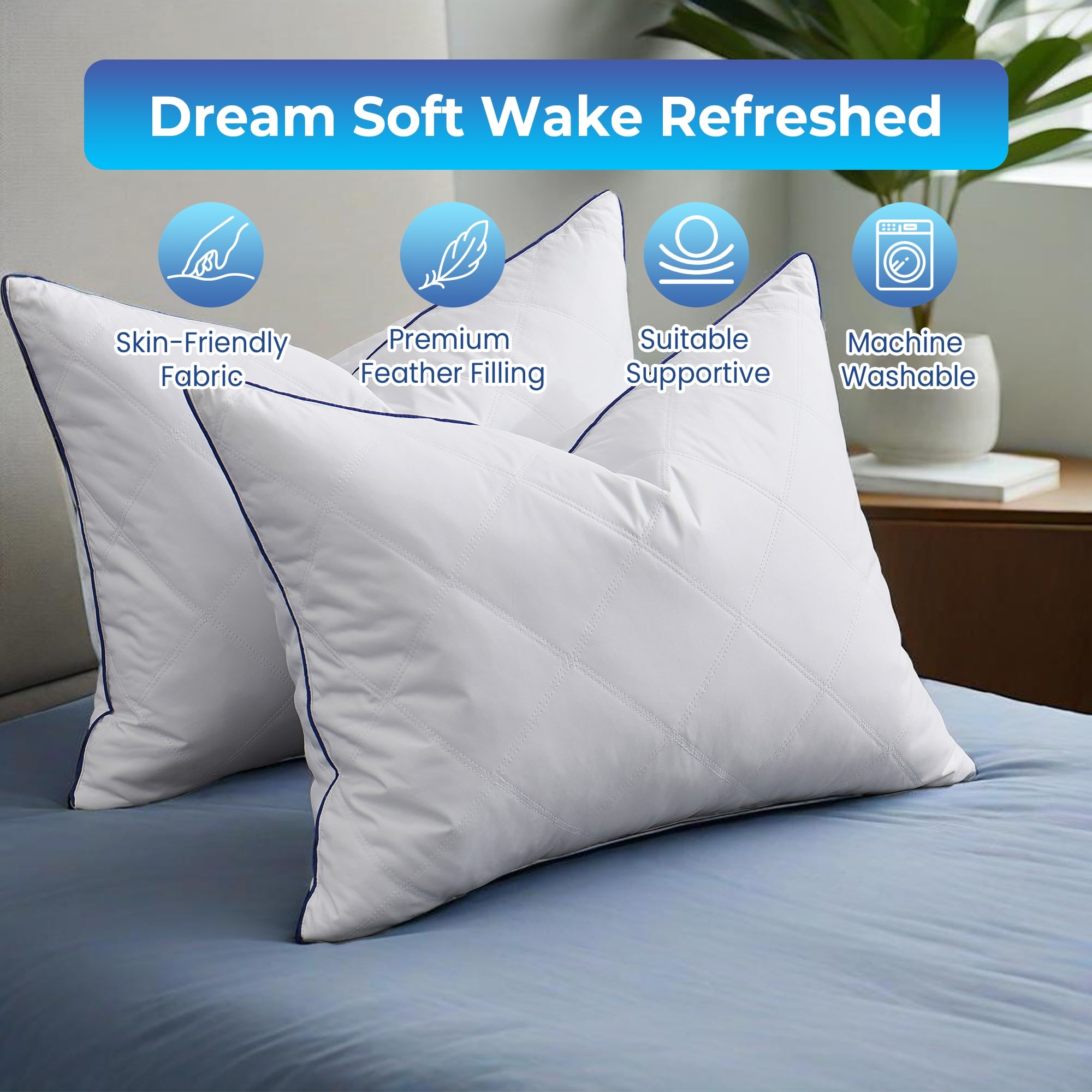 Set of 2 Goose Feather Medium-Firm Bed Pillows for Side & Back Sleepers with Quilted Cover - White