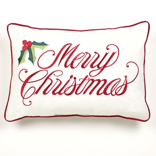 Holly Wreath Christmas Embroidered Pillow Ivory Rectangle, Rectangle, Ivory