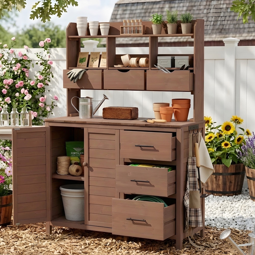 Large Outdoor Farmhouse Solid Wood Potting Table with 2 Drawers,Cabinet and Open Shelves