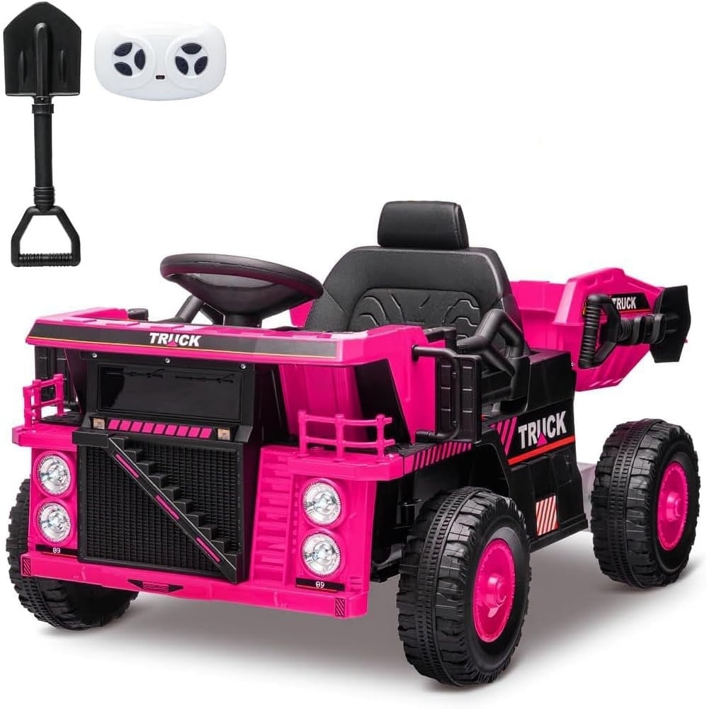 12V Kids Ride On Dump Truck, Electric Construction Car w/ Remote, Lift Bed, Shovel, Music & LED Lights