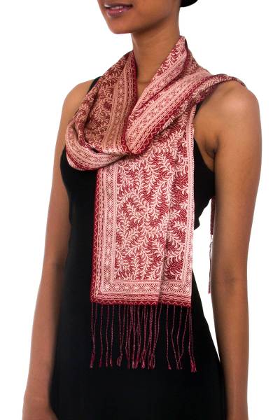 Silk batik scarf, 'Red Fern' - Handcrafted Silk Batik Scarf