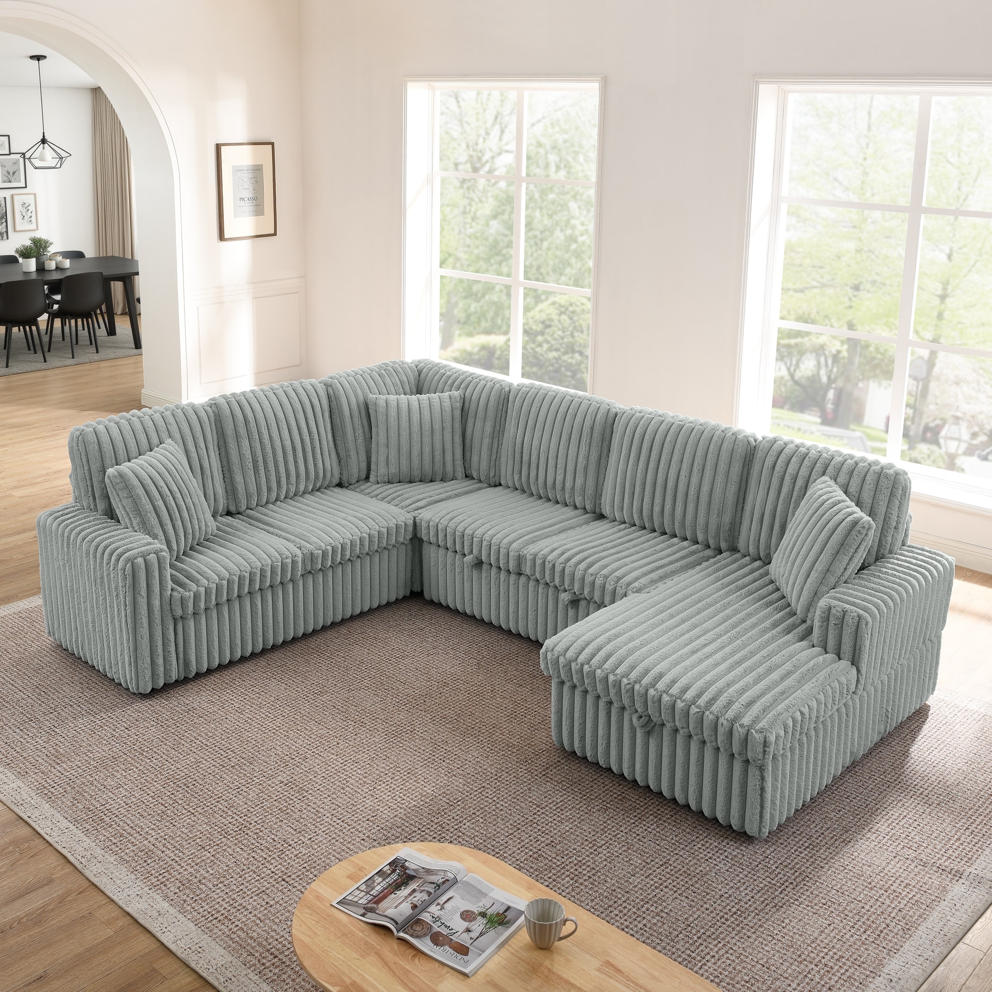 Corduroy Upholstered Reclining Sofa U-shaped Sleeper Sectional Couch with Pull Out Bed, Storage Chaise and Adjustable Backrests