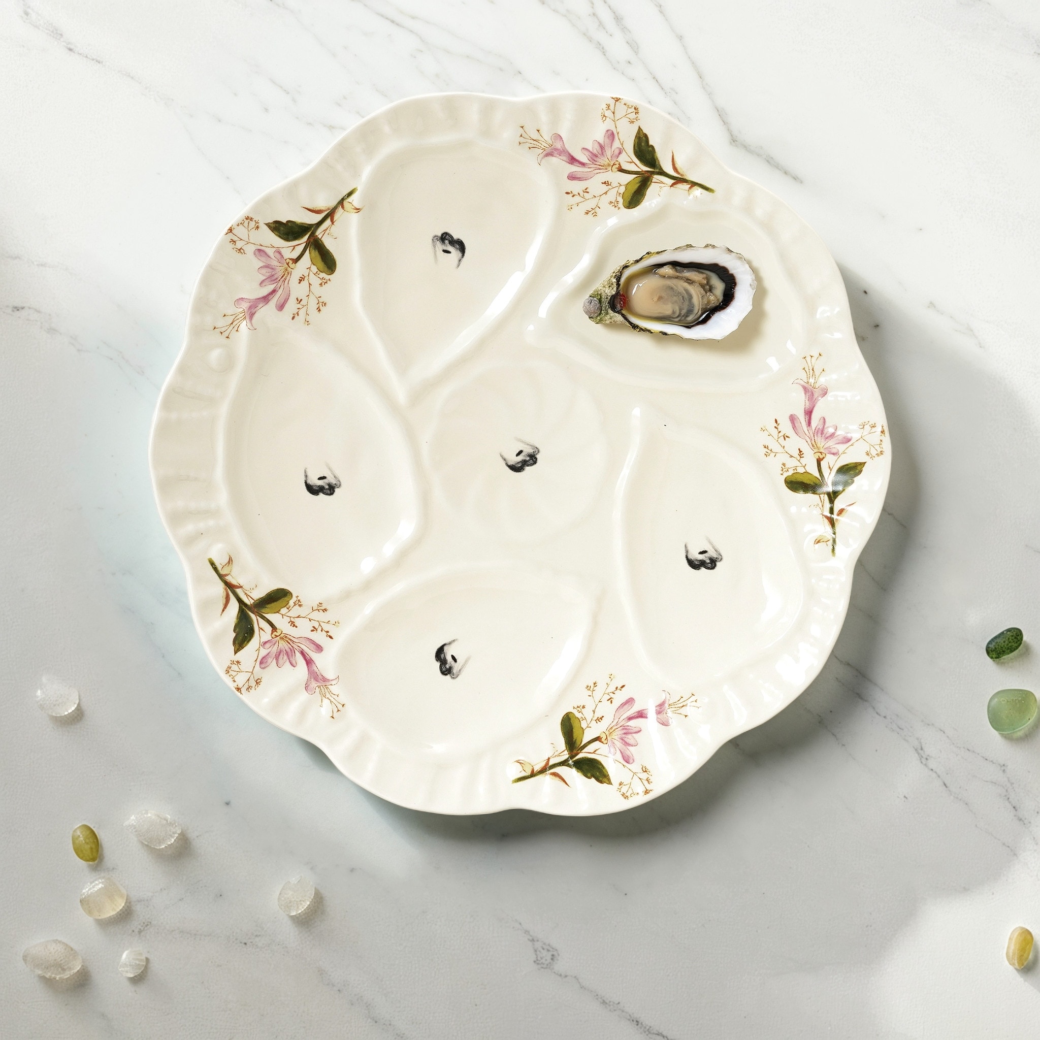 Vintage Reproduction Scalloped Stoneware Oyster Plate with Floral Design - 8.5"L x 8.5"W x 1.0"H