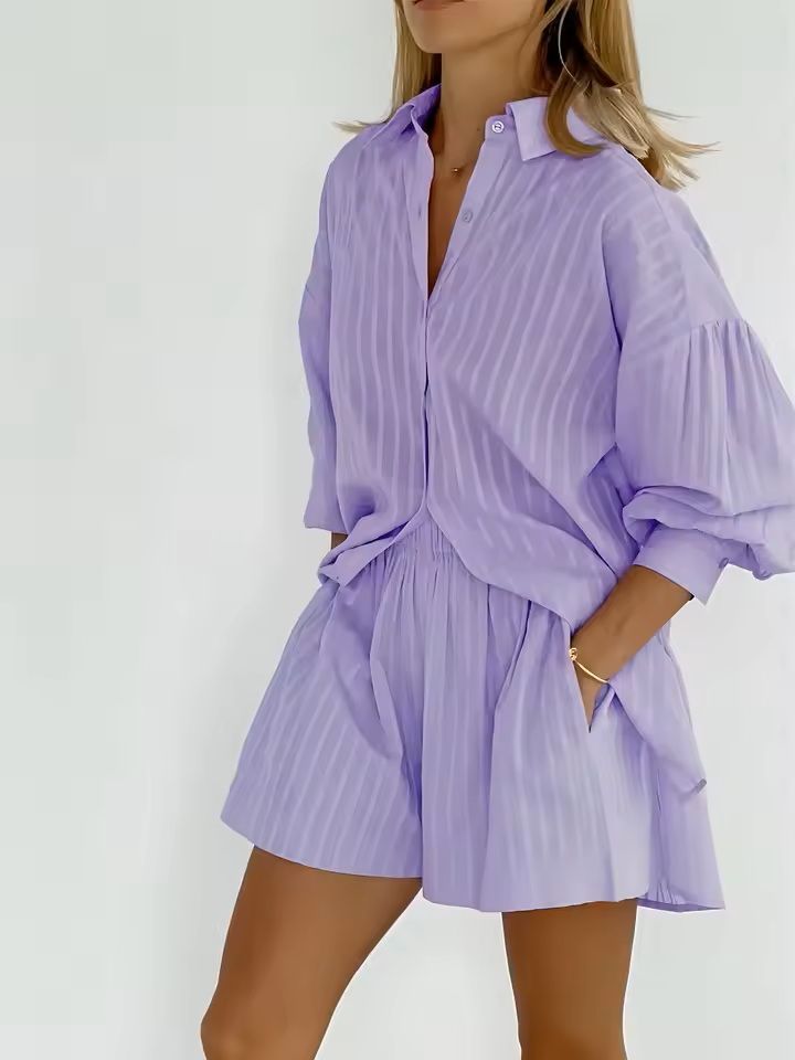 Cotton Two Piece Shorts Set For Women Long Sleeve Striped Shirt And Matching Summer Outfit s purple