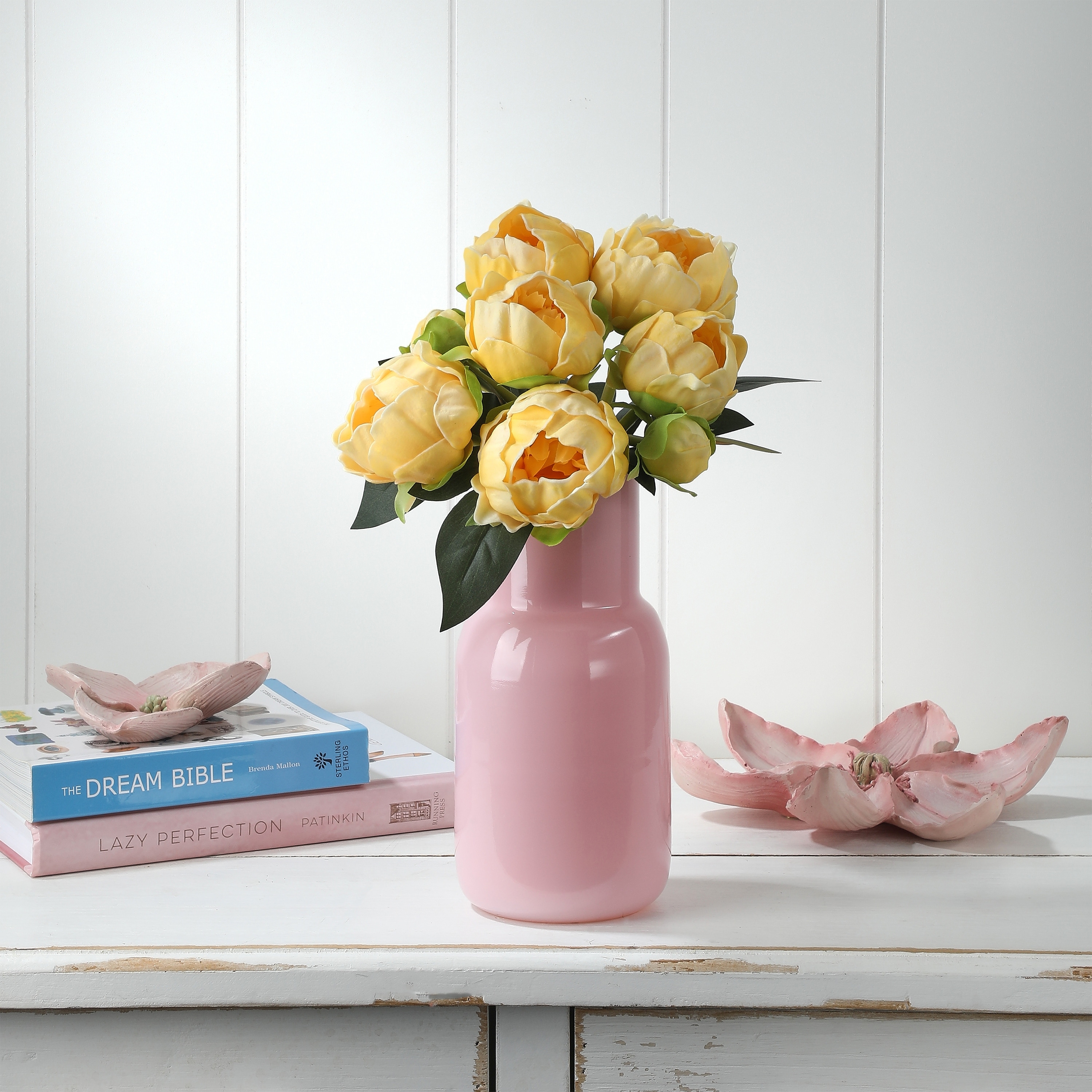 Green PU & Silk Artificial Peonies in Glass Vase with Faux Water, Modern Home Floral Decor