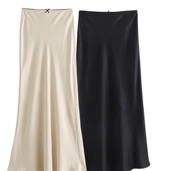 Vintage Chic Fashion Women's Satin Bow Decorated High Waist A Line Long Skirt beige s