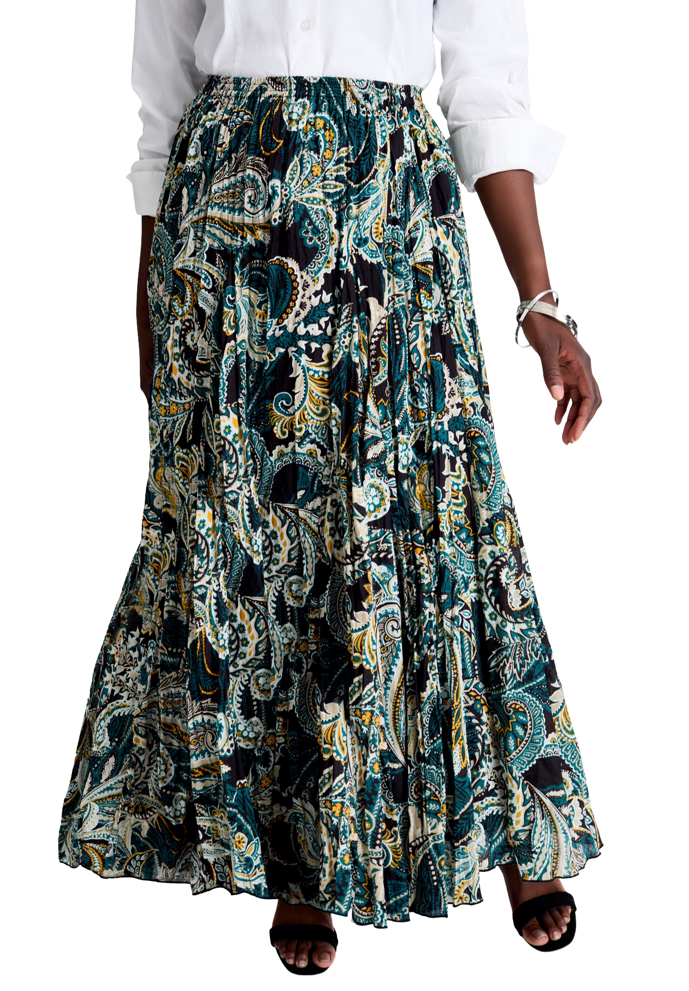 Plus Size Women's Flowing Crinkled Maxi Skirt by Jessica London in Emerald Paisley (Size 30) Elastic Waist 100% Cotton