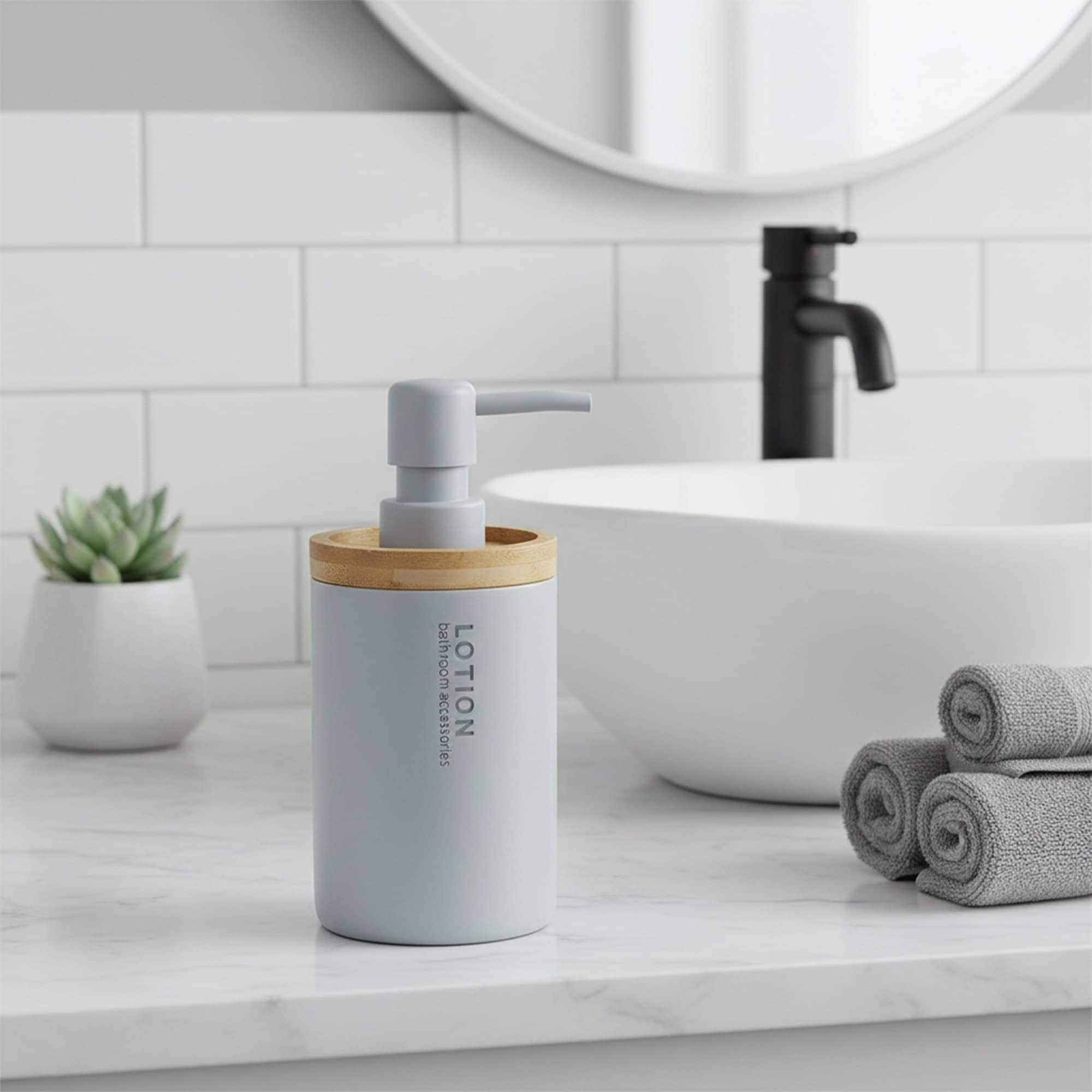 Elegant Soap Dispenser - Polyresin and Bamboo Design, Refillable Liquid Pump - 3 L x 3 W X 7 h