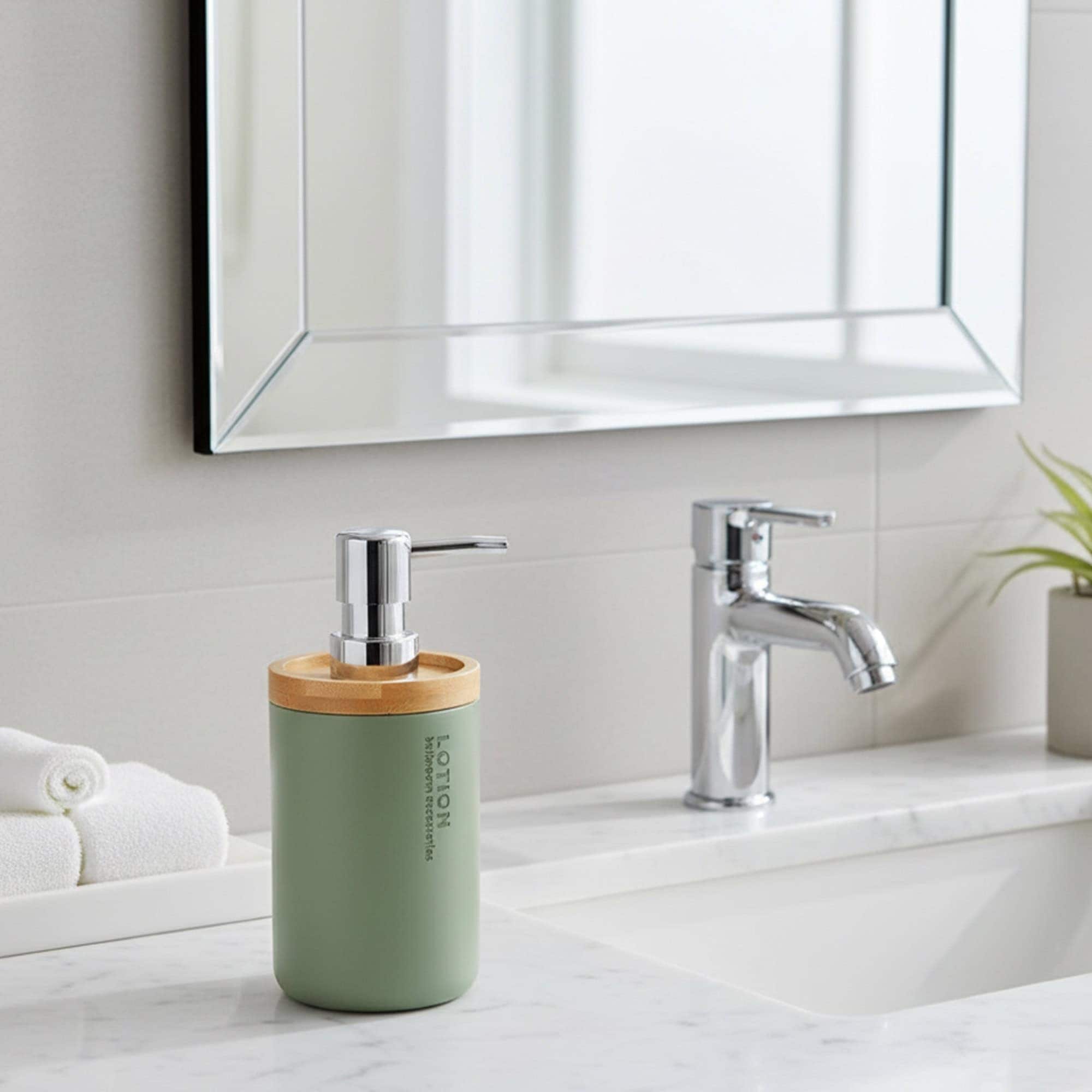Elegant Soap Dispenser - Polyresin and Bamboo Design, Refillable Liquid Pump - 3 L x 3 W X 7 h