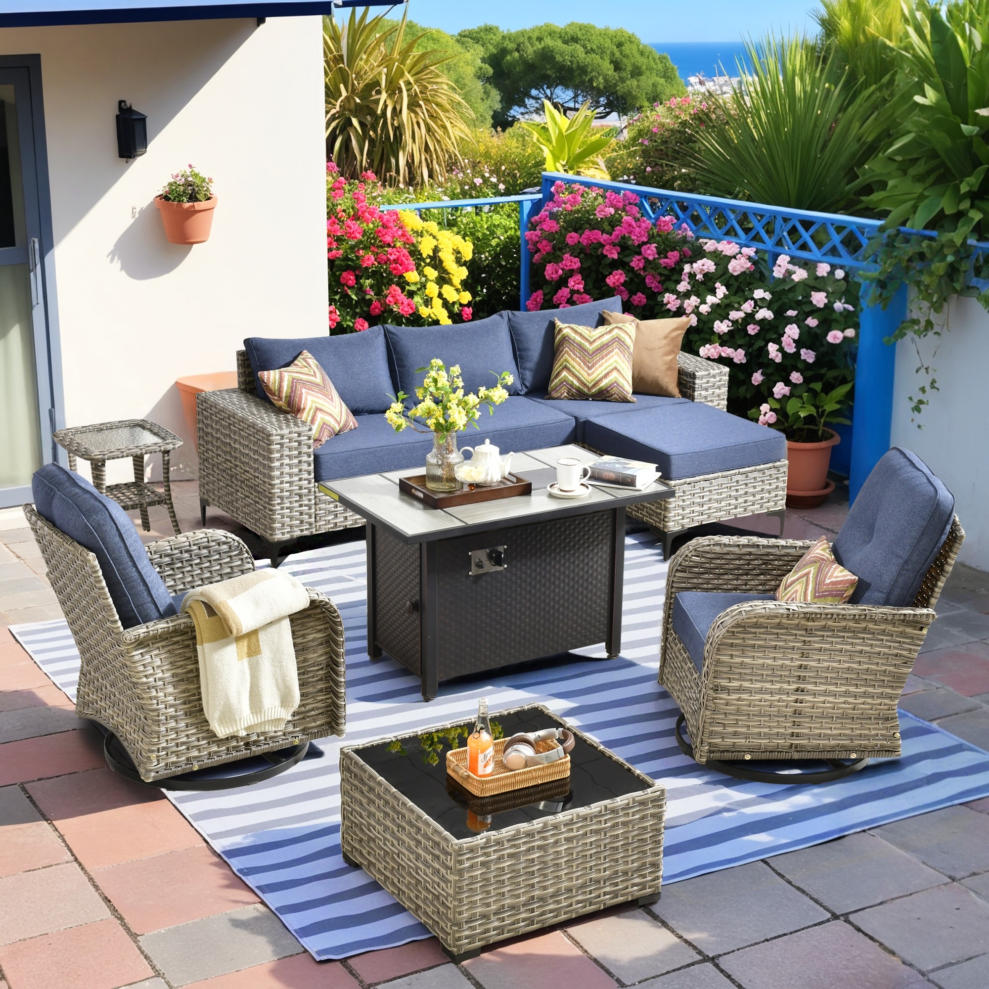 HOOOWOOO 9-piece Wicker Patio Wide Armrest Sectional Sofa Set with Swivel Chairs and Fire Pit