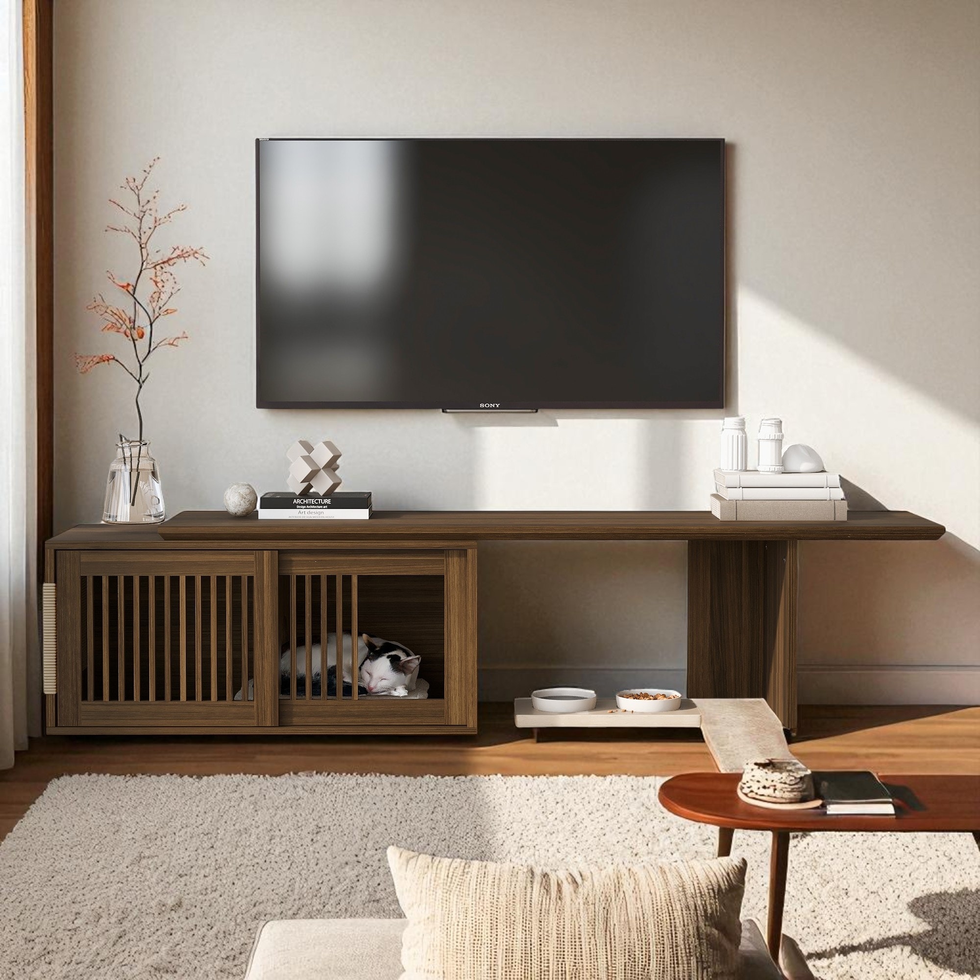 Extendable TV Stand with Sliding Shutter Doors, Adjustable 78"-110" Length, MDF Wood Entertainment Cabinet with Storage