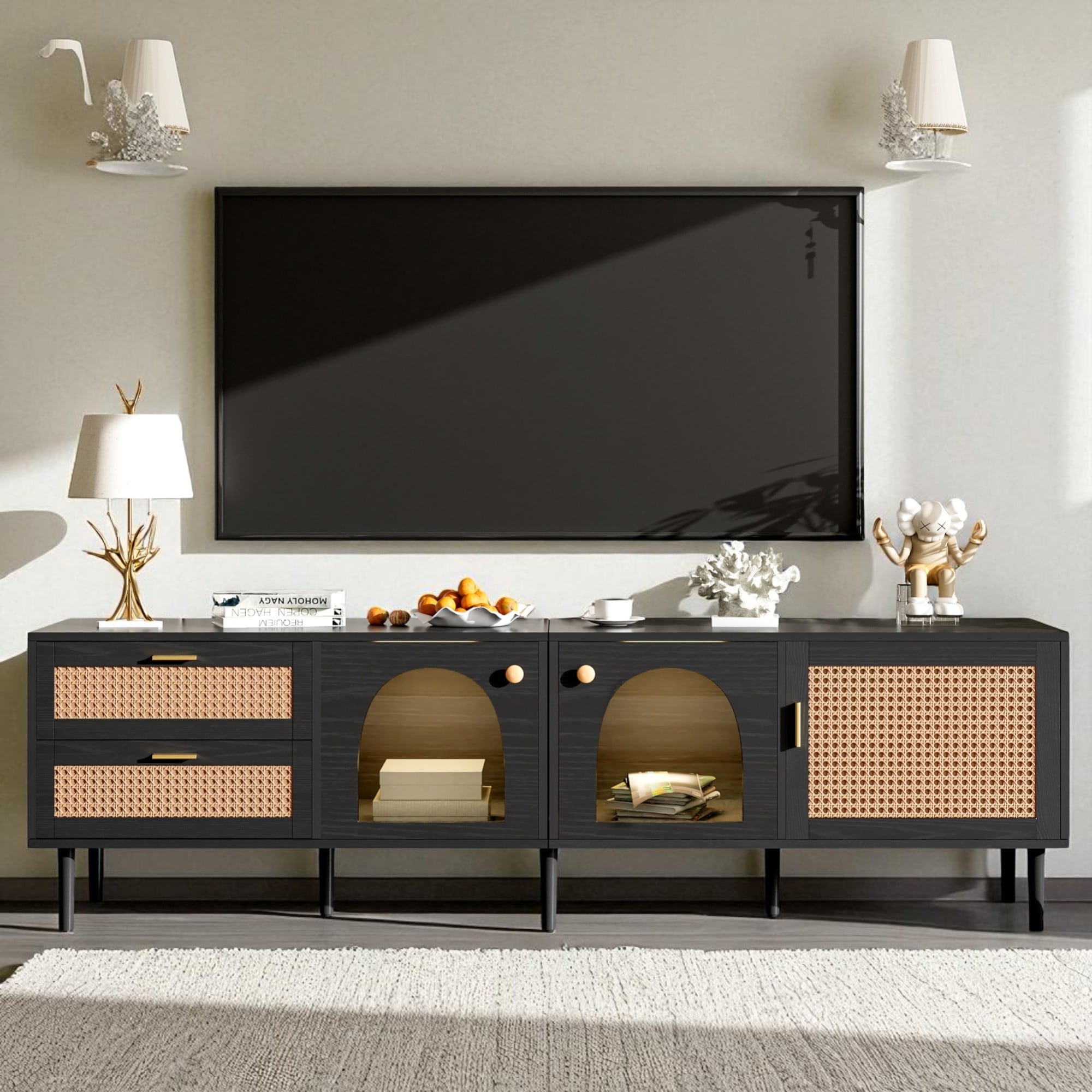 Rattan TV Stand for TVs up to 80", 70.8'' Media Console with 3 Cabinets, 2 Drawers & LED Light, Modern Entertainment Center