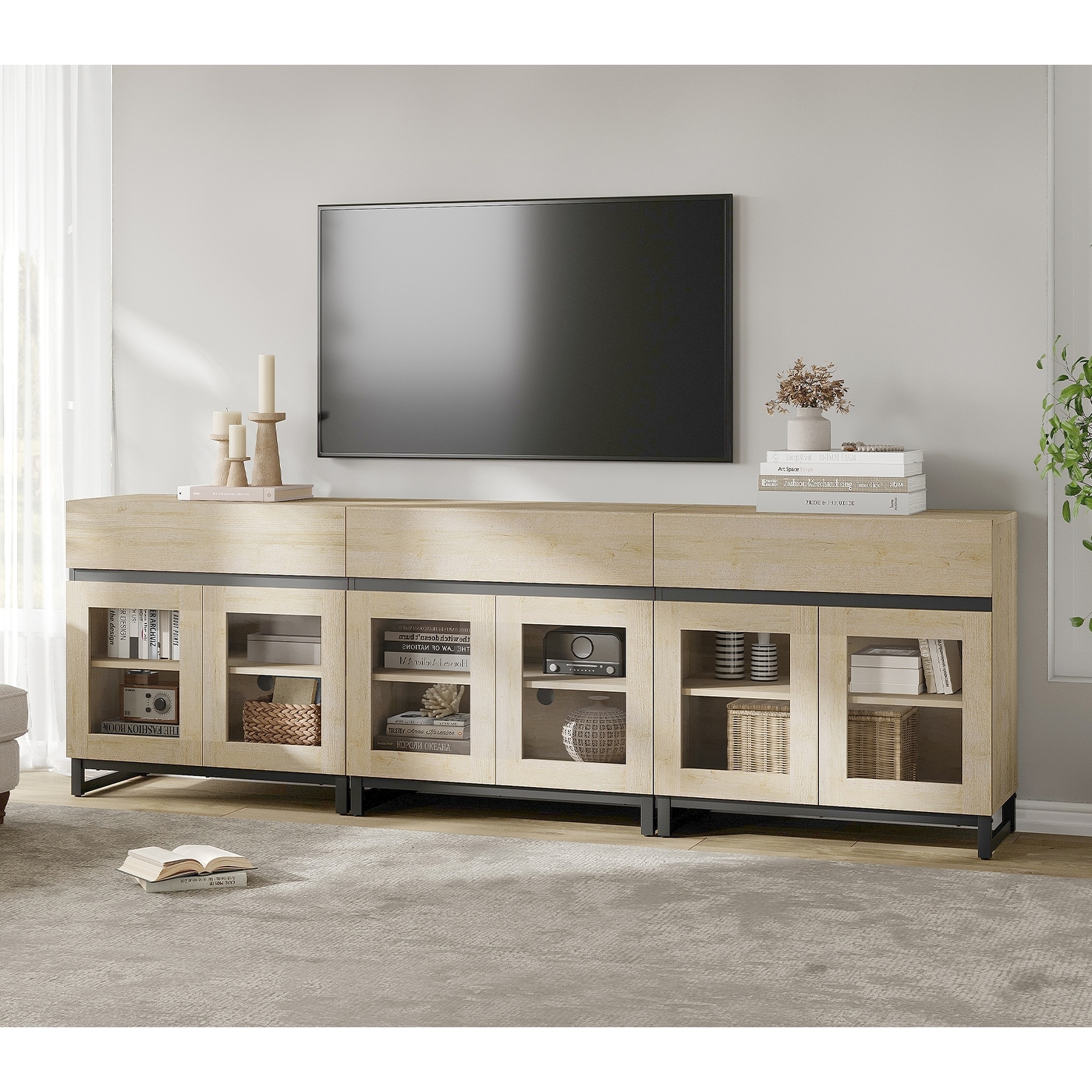 WAMPAT Modern TV Stand with Glass Doors for 110 inch TVs, Entertainment Center Console with 3 Drawers and Metal Base