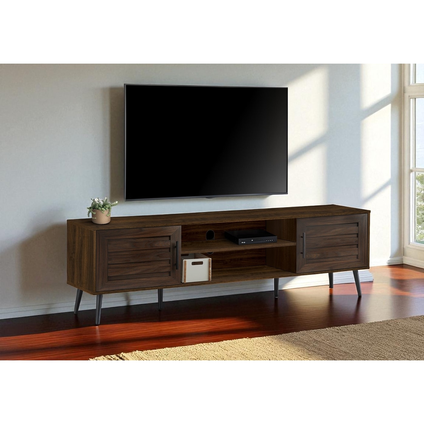 Stylish 70" Mid-Century Modern TV Stand for 80" TVs - Features Glass Shelf and Adjustable Doors